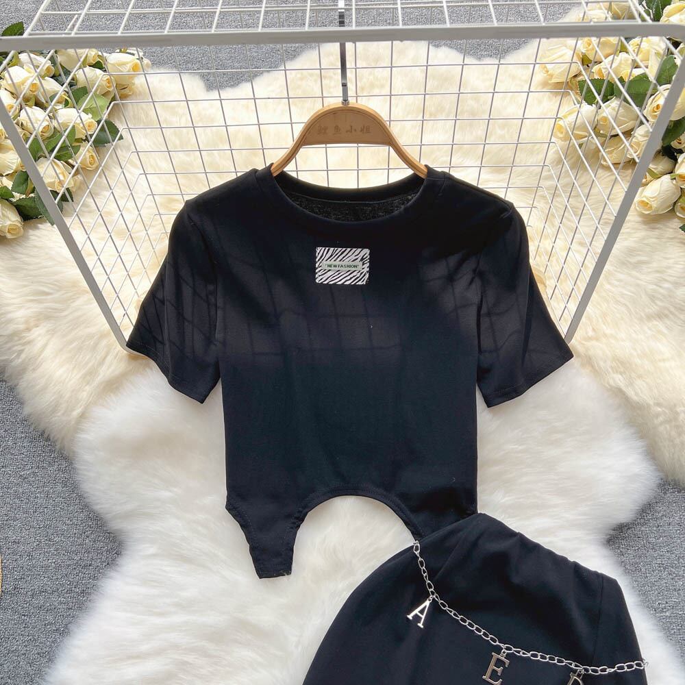 ソリッドブラックレディースツーピースセット半袖クロップトップ+ウエストサイドスリットスカートマッチングストリートホット ショート ハーフスリーブ ソリッドカラー Abe95719046917