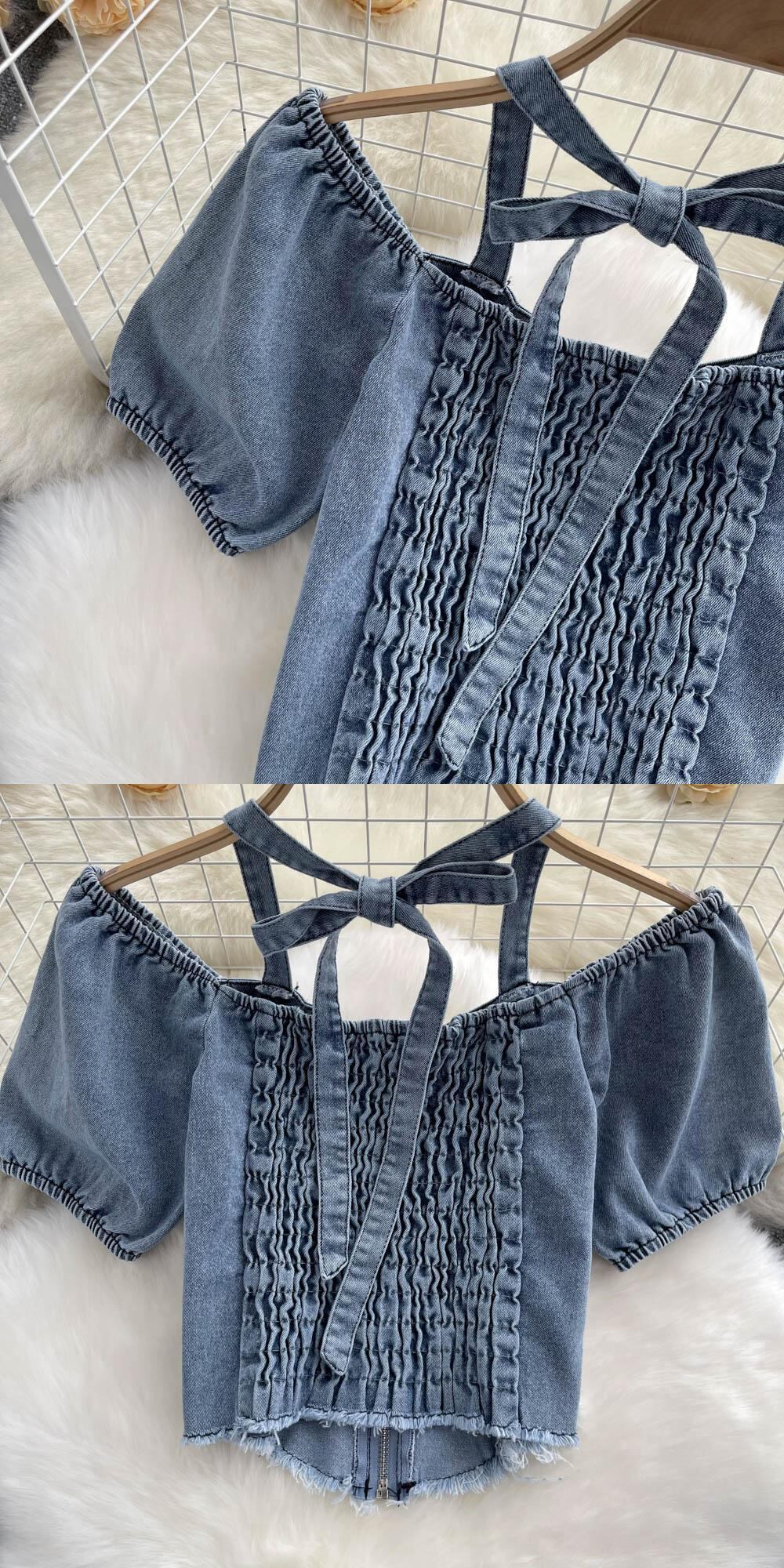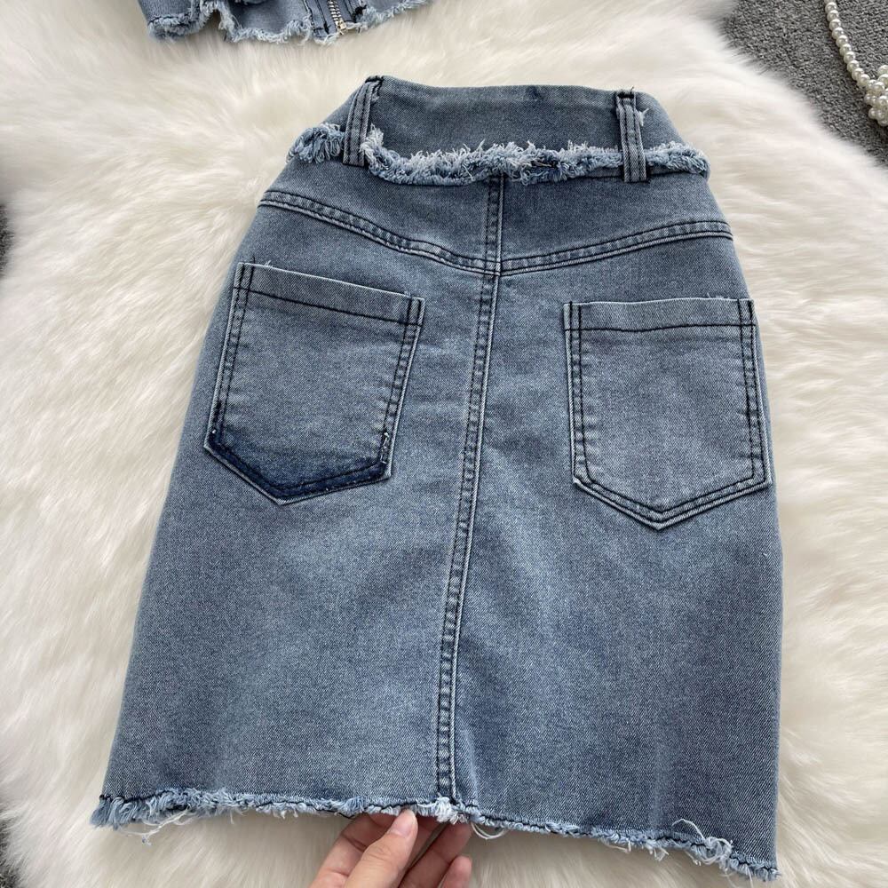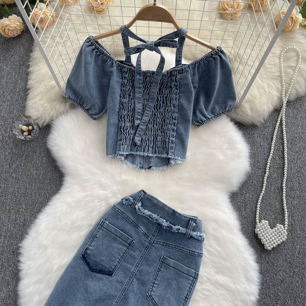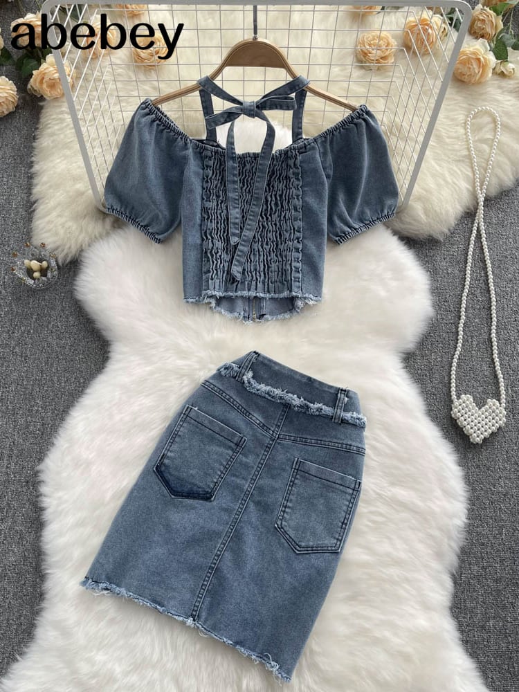 ツーピースセット女性の夏のデニムスカートスーツクロップドスラッシュネックトップとミニボディコンウエストスカートセクシーセット サマー 夏物 Abe40824129561