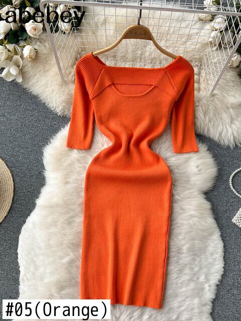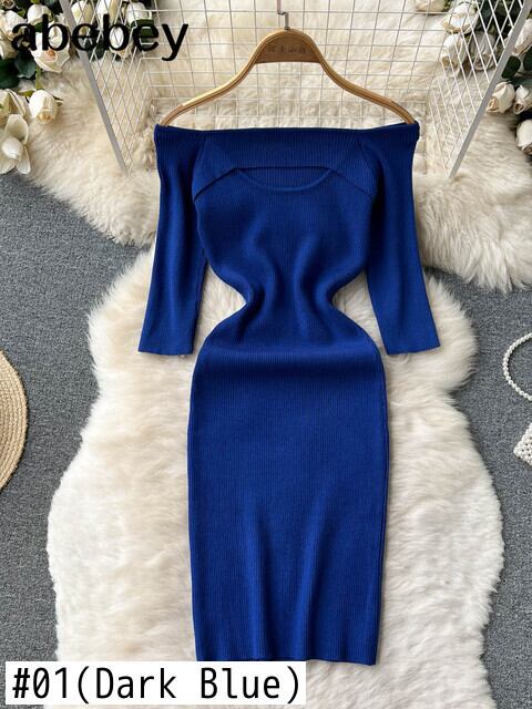 女性の夏のニットドレス 2022 スラッシュネックストリートスリムミディショートサンドレス弾性ウエストセクシーなボディコンドレス エラスティック 伸縮 サマー 夏物 Abe1359596697