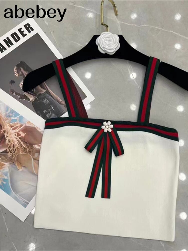 カラフルなストライプ ニット キャミソール トップス女性スパゲッティ ストラップ ボタン弓クロップド トップス ニットウェア Sleevelss リボン Abe53716005724