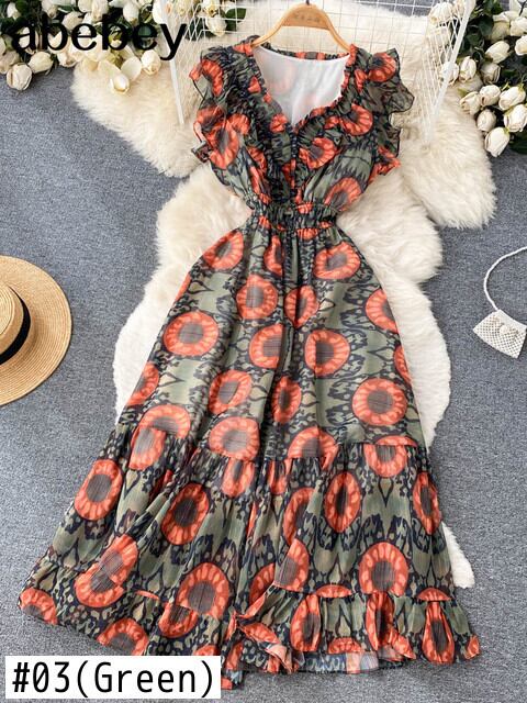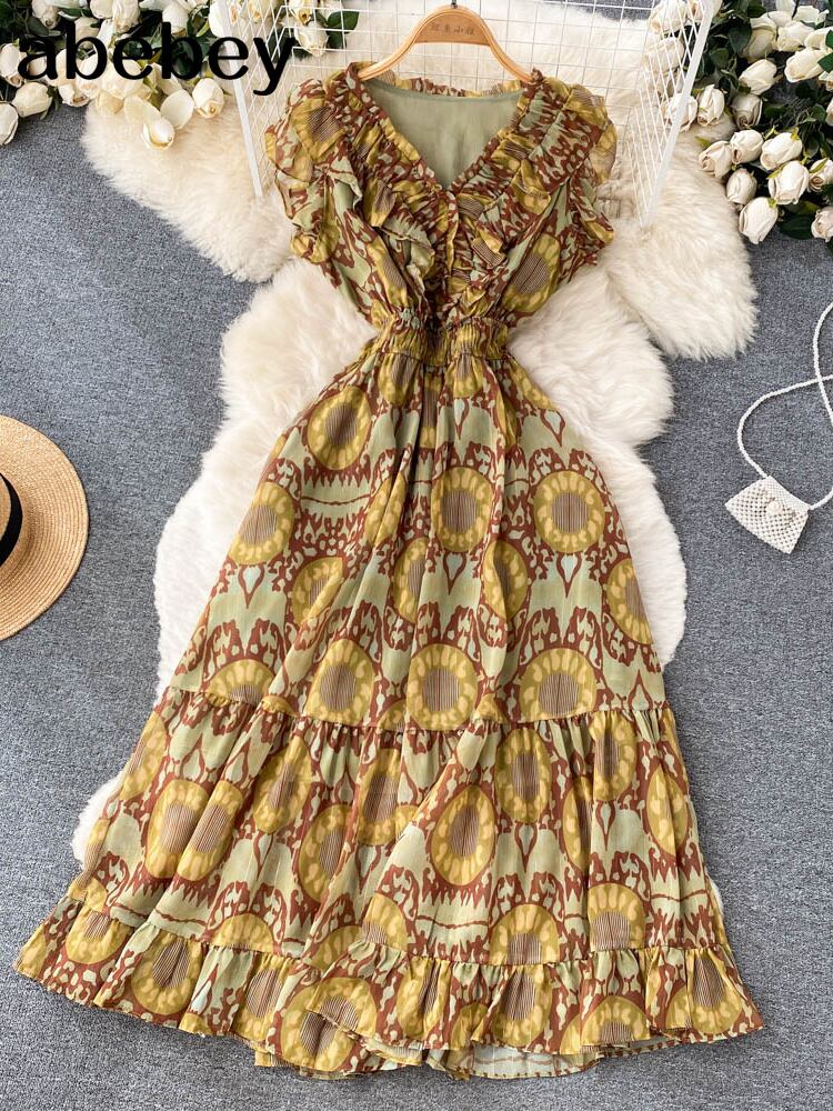 夏の女性プリントプリーツマキシドレス V ネックノースリーブウエスト A ラインドレープビッグスイングスリム Vestidos サマー 夏物 Vネック Aライン Abe14906742620