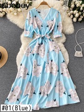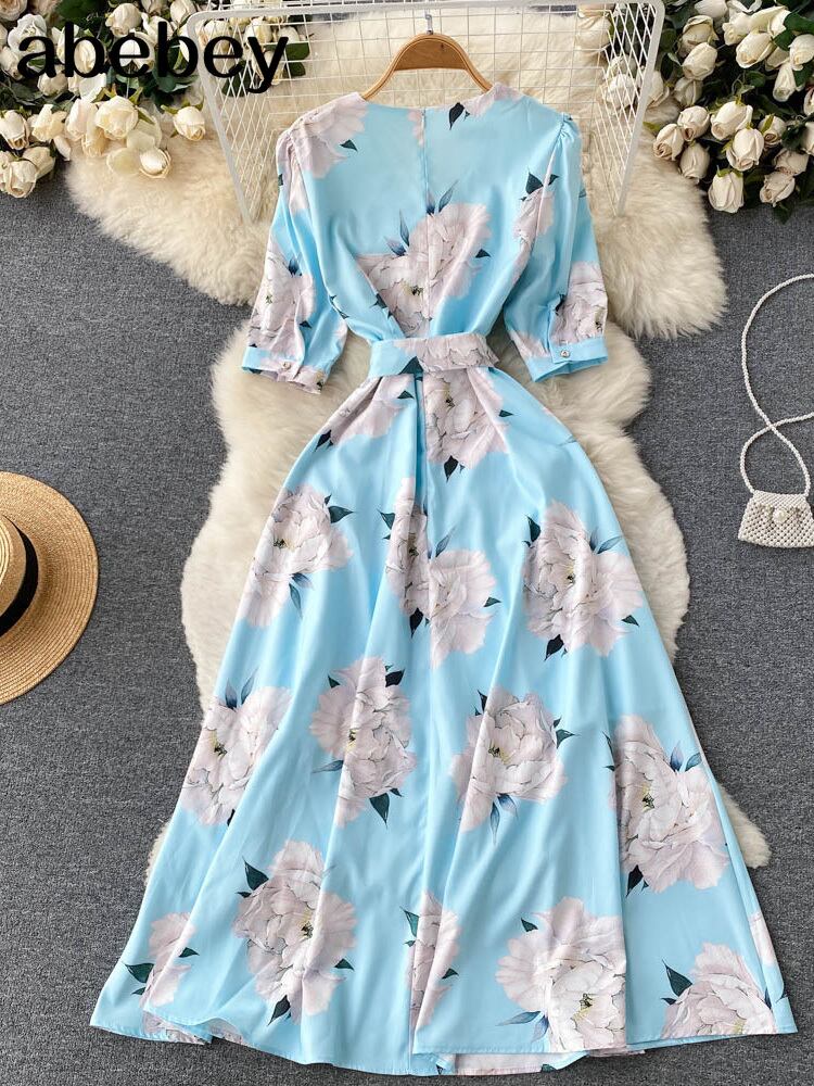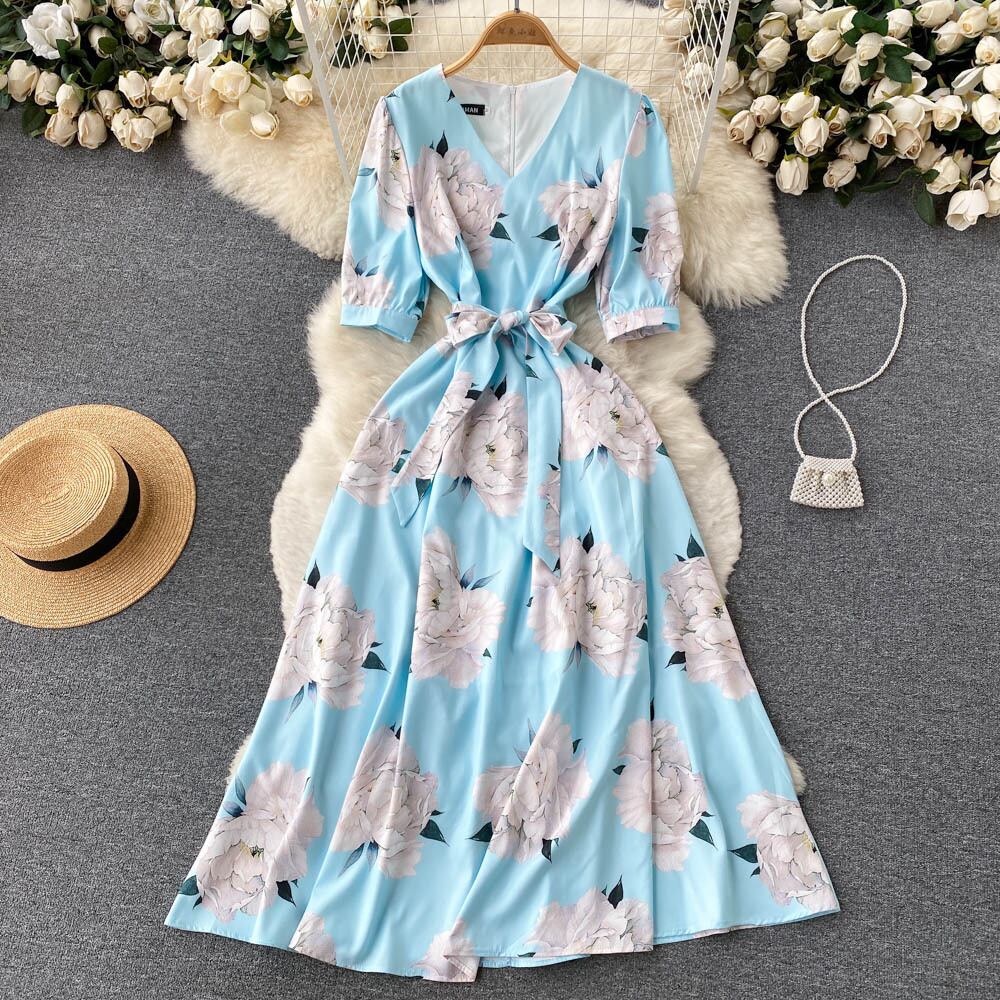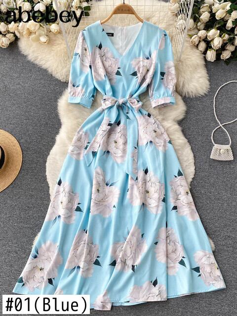 夏の女性プリント シフォン ドレス V ネック ショート パフ スリーブ ウエスト A ライン Vestidos でサッシ サマー 夏物 Vネック Aライン Abe88000590985