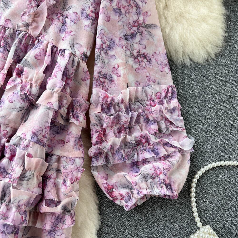 フレンチ ロマンス パープル フローラル シフォン ドレス ルーズ ウエスト レディース サマー ランタン スリーブ V ネック 膝丈 ドレス ランタンスリーブ 夏物 花柄 Vネック Abe54983898769