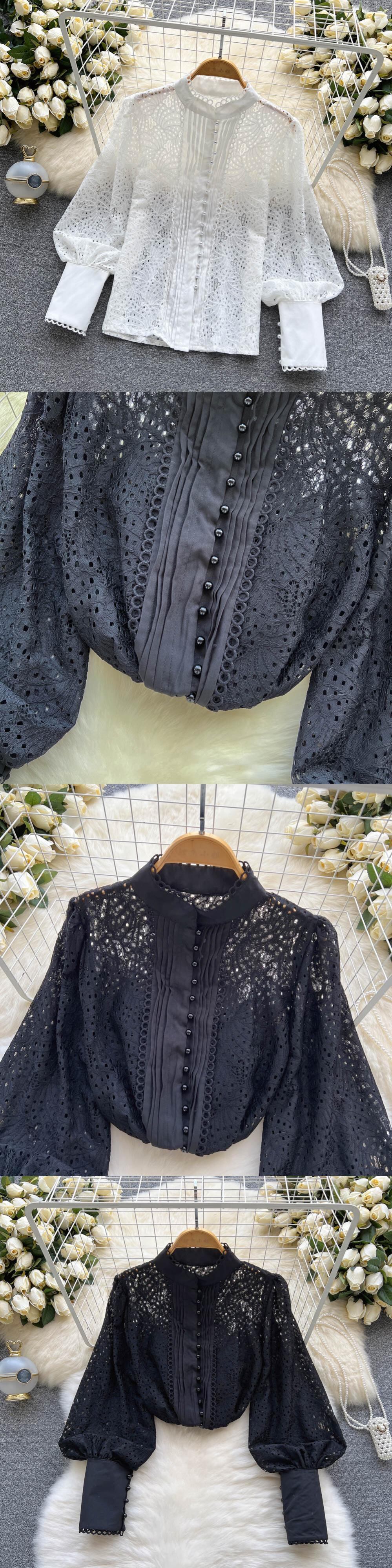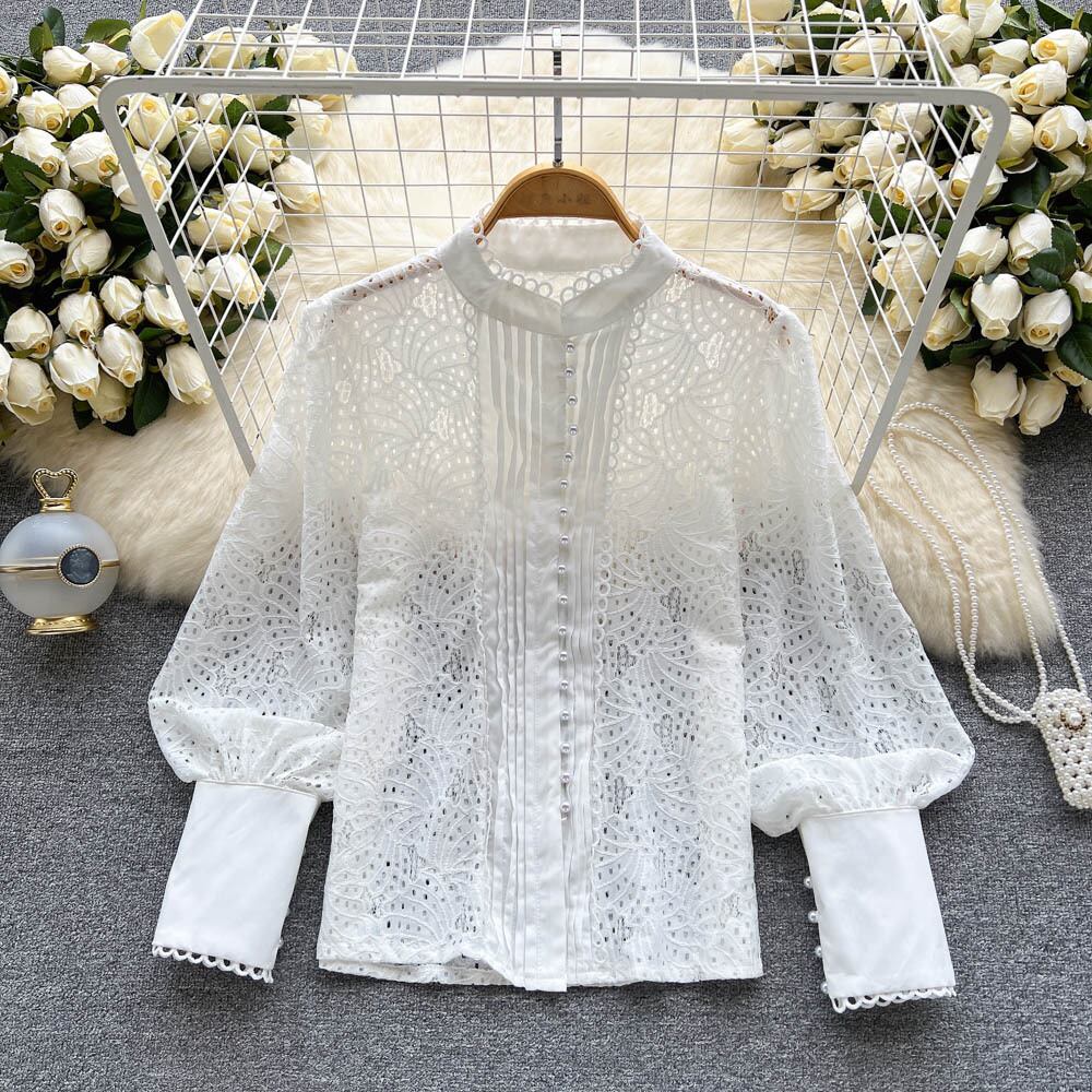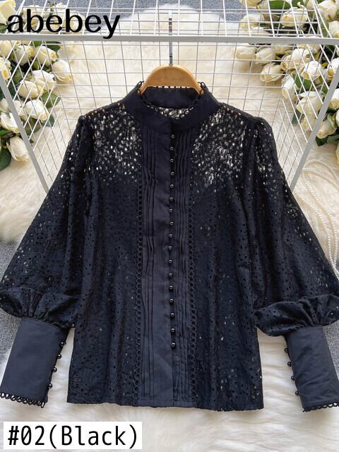 女性のセクシーなペスペクティブ ビーズ レース ブラウス ホワイト ランタン スリーブ トップス シャツ ランタンスリーブ Abe89205860387