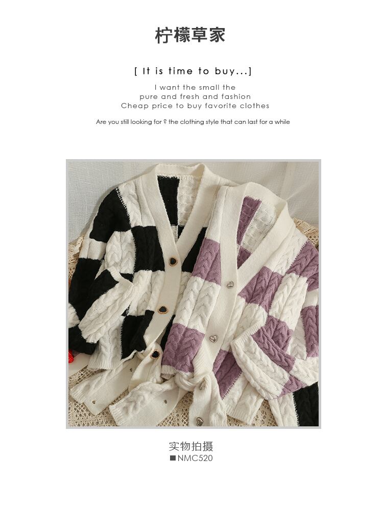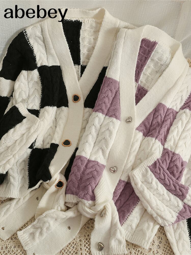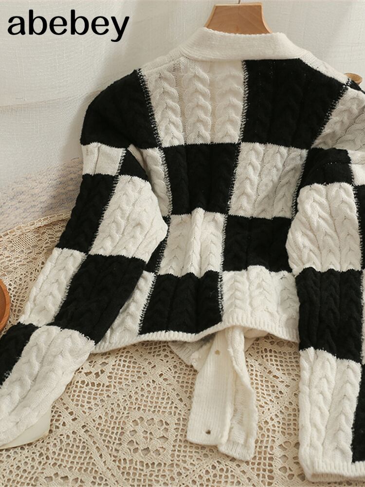 V ネック格子縞の市松模様のカーディガン女性長袖 2022 秋冬シングルブレストセータージャンパー ロング オータム 秋物 ウィンター 冬物 Vネック Abe81375401223