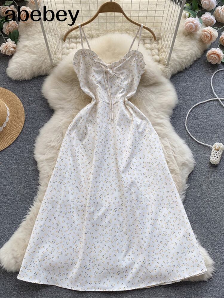 女性フローラル プリント シフォン ミディ ドレス背中の開いた結ばれた薄いストラップ ドレス Vestidos 花柄 Abe33450843138