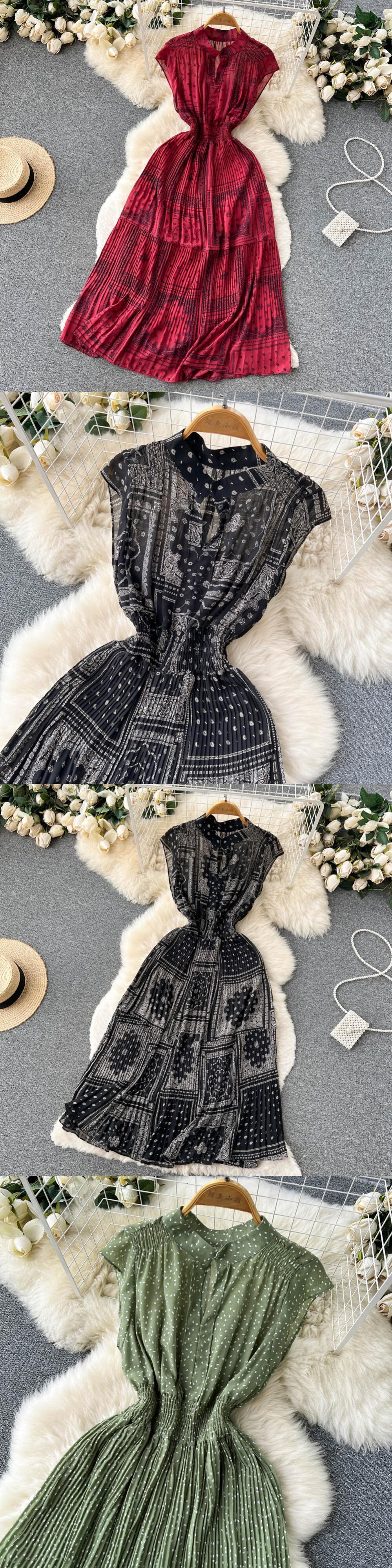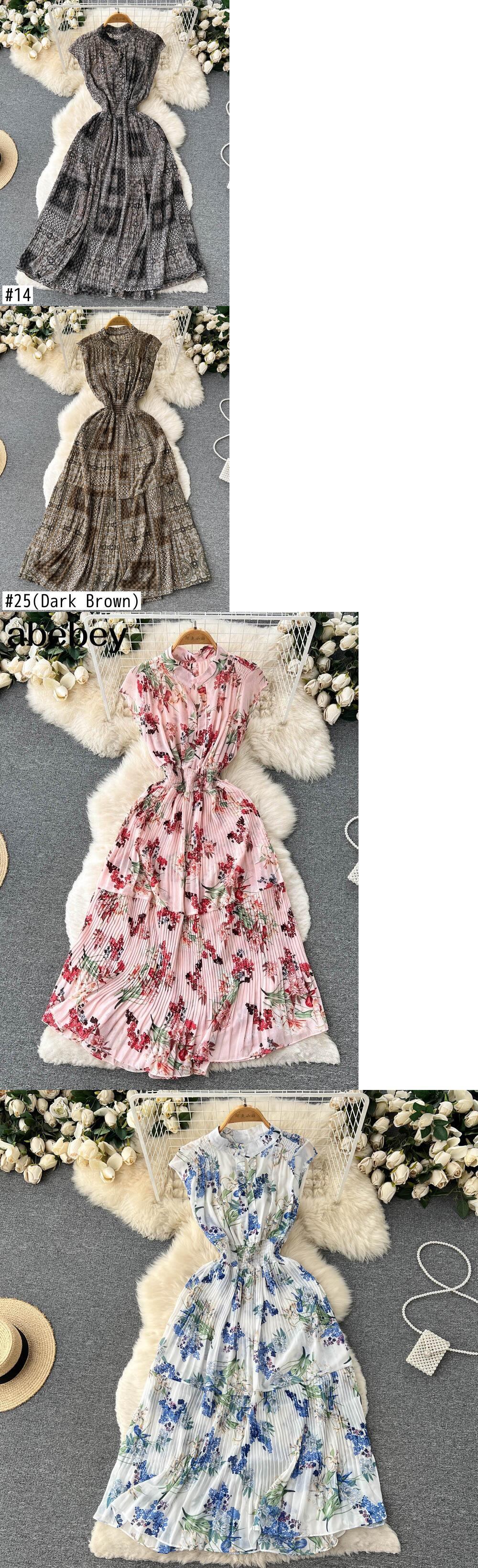 フレンチプリーツ女性ドレスフリルノースリーブボタンシースドレスネクタイ調整 2022 Vinage サマードレス ラッフル 夏物 Abe80623466145
