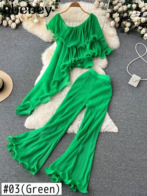 2022 夏の女性のレトロなシフォン不規則なセットスリムショートトップス + ウエストロングフレアパンツツーピーススーツ衣装 レッド サマー 夏物 Abe79873047747