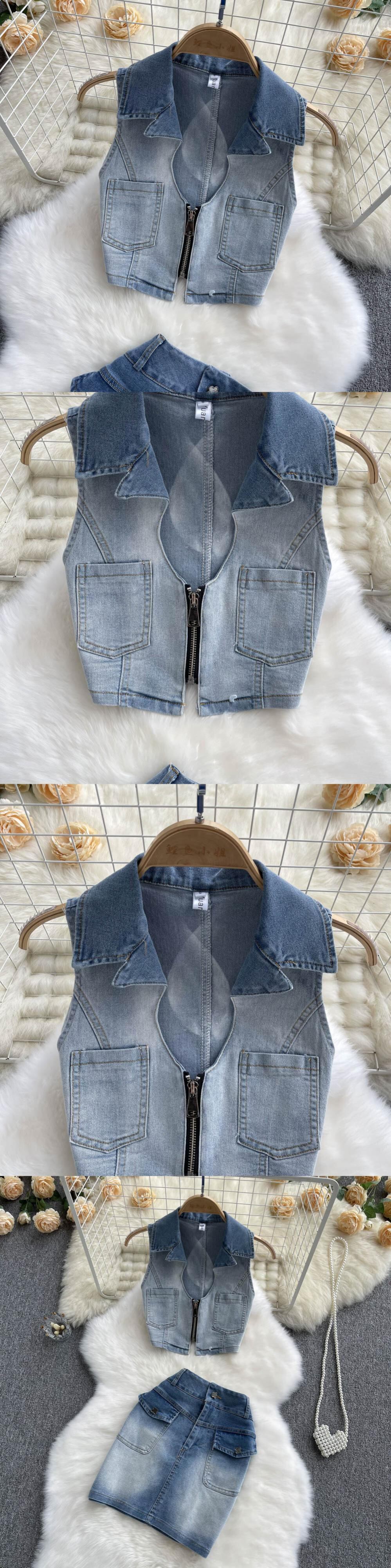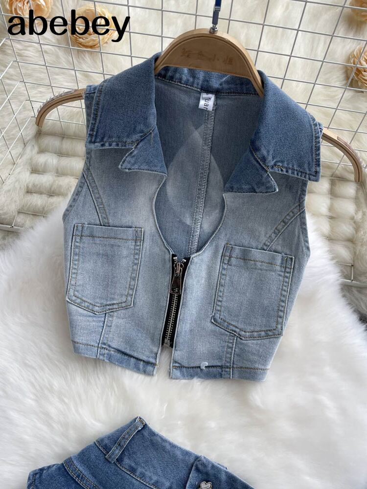 2022 タンクデニムセクシーな女性セットジッパーボタンポケットストラップレス背中の開いたトップデニムミニスカートツーピースセット Abe35737511951