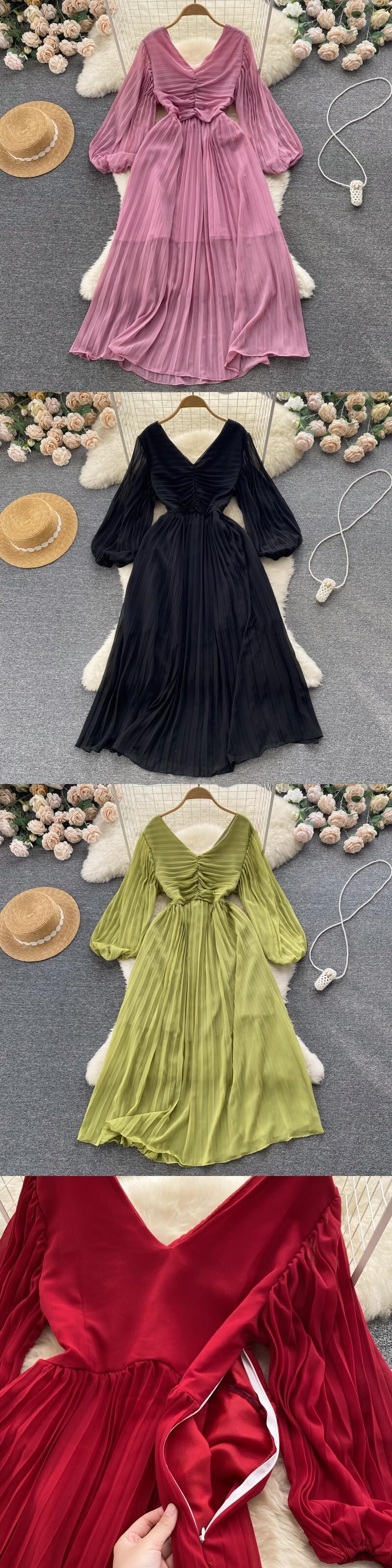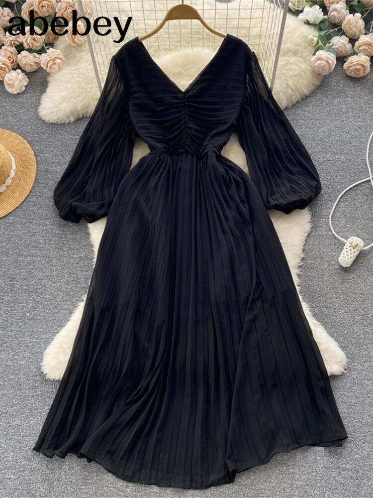 秋の女性プリーツ ロング ドレス V ネック パフ スリーブ ウエスト A ライン ドレープ マキシ Vestidos オータム 秋物 Vネック Aライン Abe134538784
