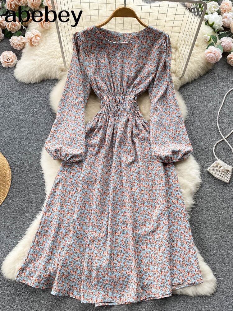 春秋の女性プリント O ネック パフ スリーブ ドレス ホリデー スタイル ウエスト A ライン ミディアム ロング ドレス スプリング 春物 オータム 秋物 Oネック Aライン Abe97518727372
