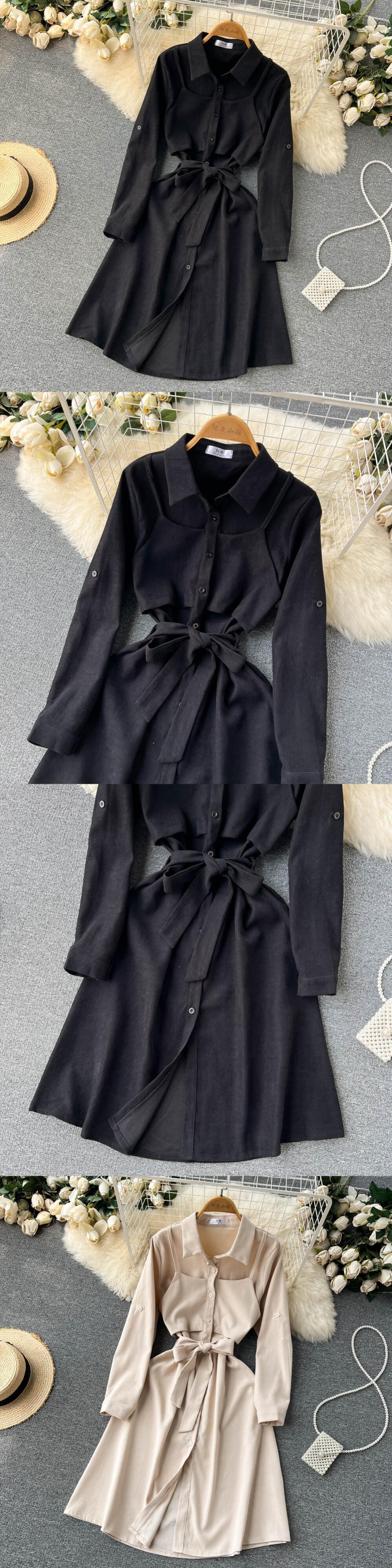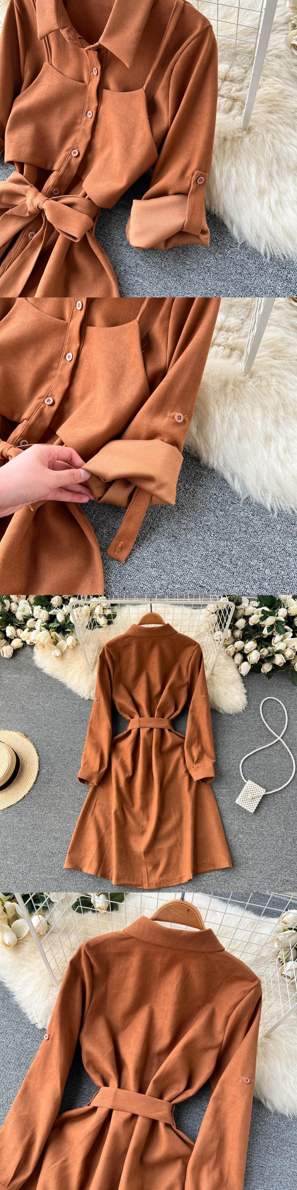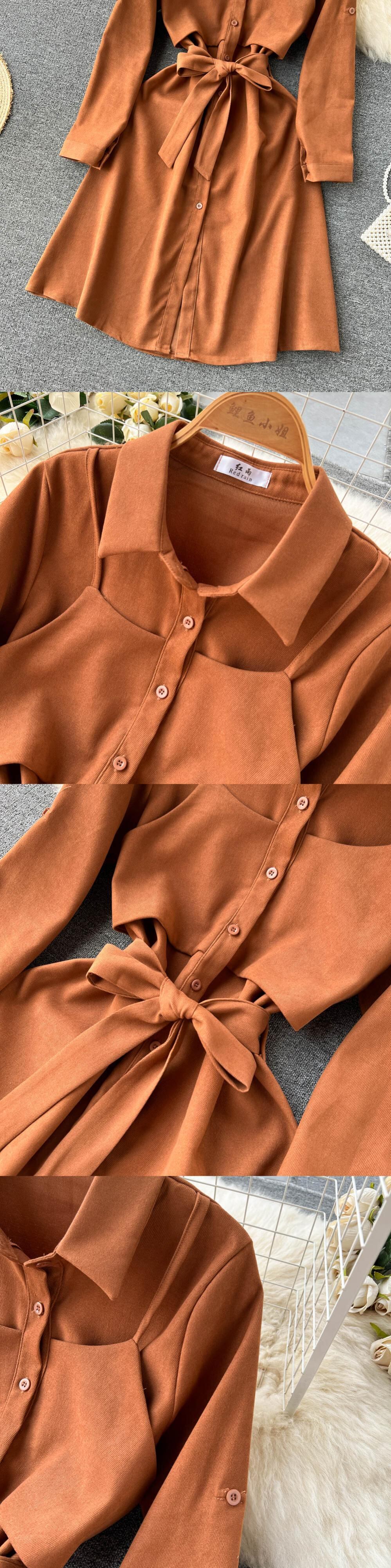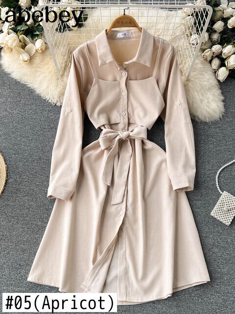 秋の女性のソリッドロングドレスターンダウン襟シングルブレストウエスト A ラインマキシ Vestidos オータム 秋物 Aライン ソリッドカラー Abe51282360625