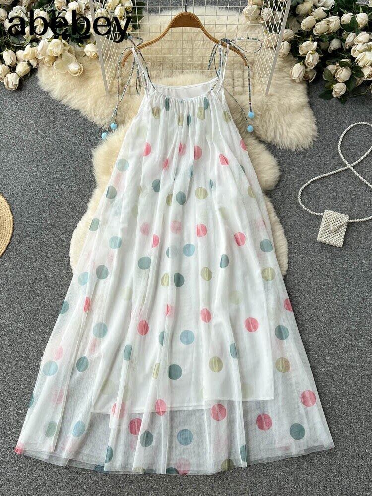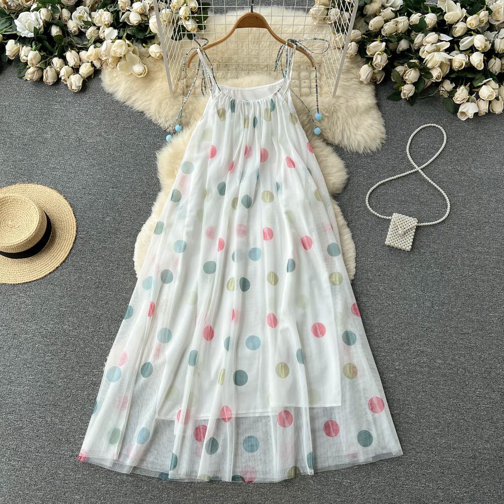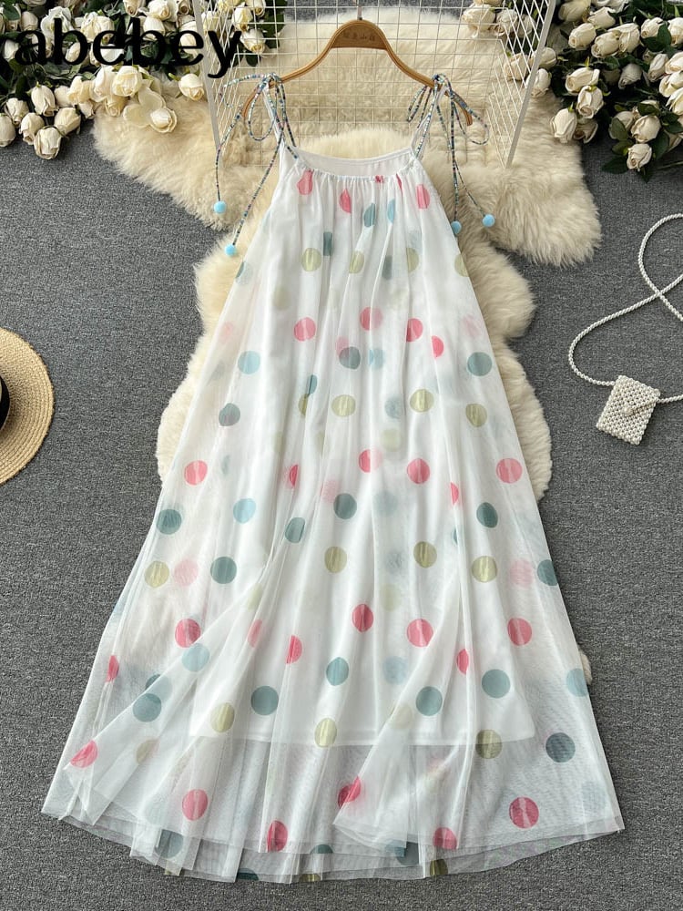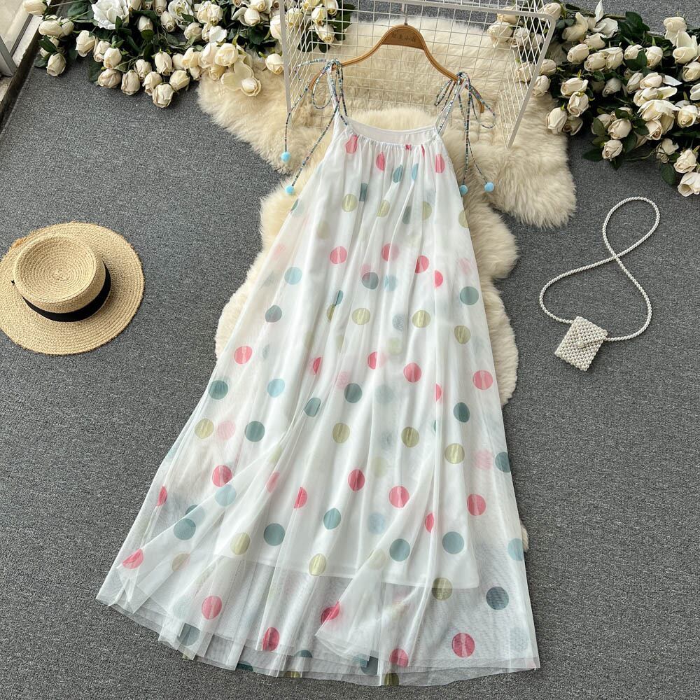 ホワイトサマードレス女性ドットプリントマキシドレス床の長さボヘミアンスパゲッティストラップ背中の開いたロングスイングドレス 夏物 Abe99531439696