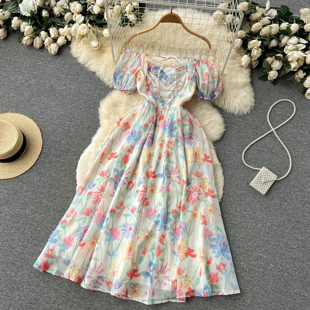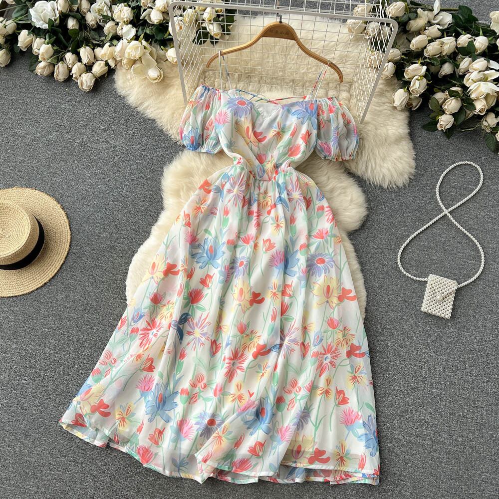 女性の夏の休日のセクシーなストラップマキシロングドレスビーチパーティーオフショルダースリムフリル Vestidos 花柄ドレス ラッフル サマー 夏物 Abe38987715492