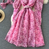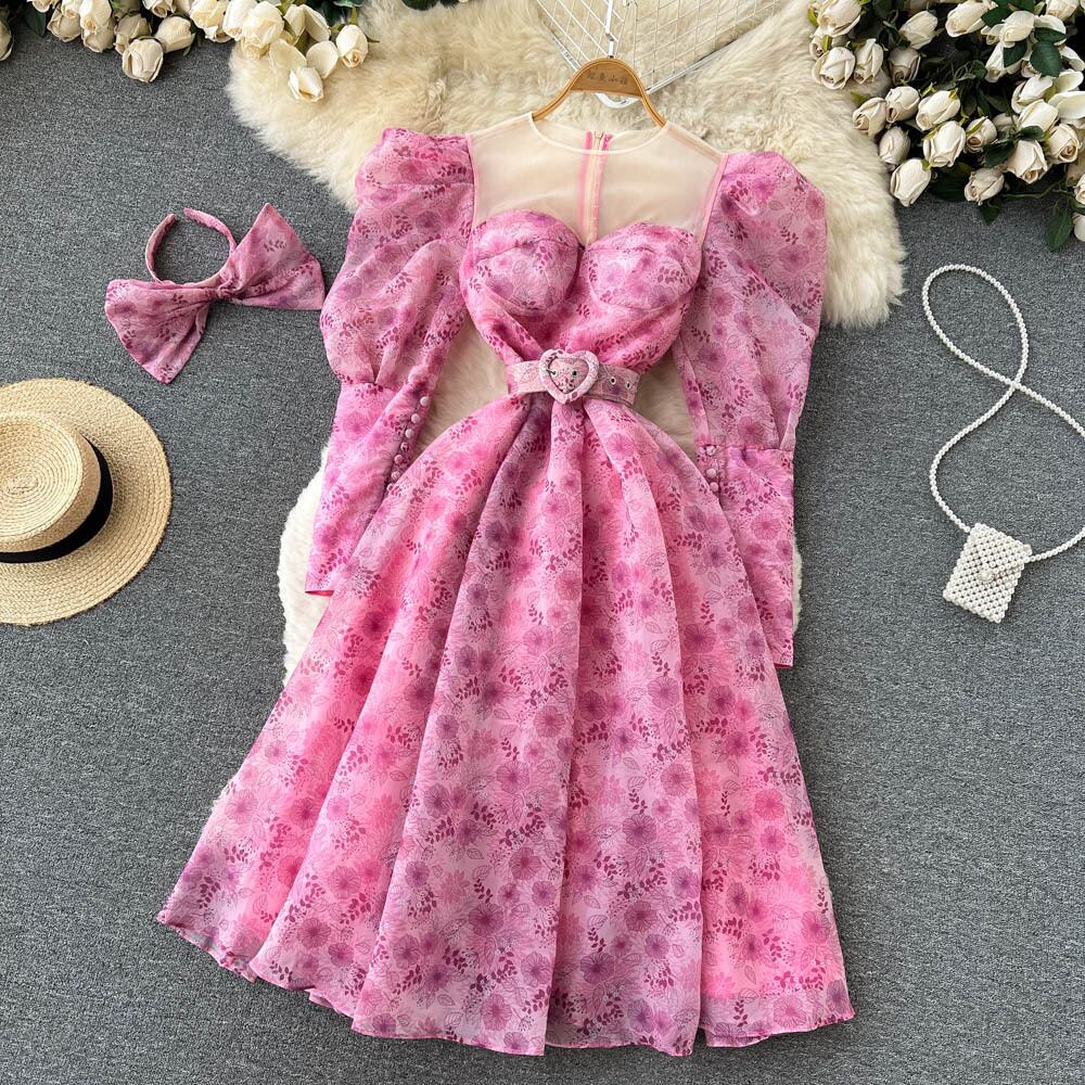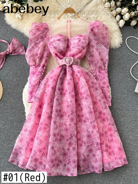 ピンクフラワープリントドレスの女性とベルト 2022 パフスリーブウエストパーティードレス女性服ビーチ Vestidos ハーネス フラワーデザイン Abe28906363806