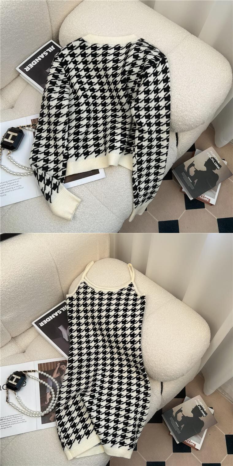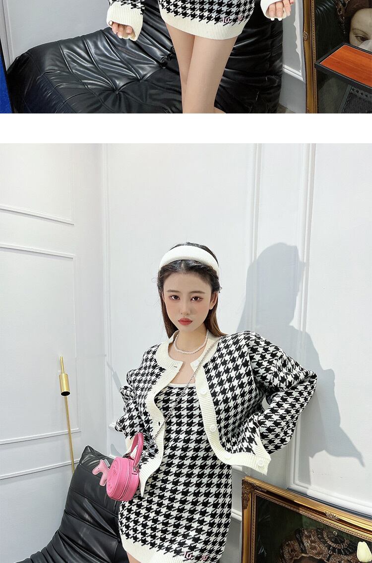 パーティーツーピースセット2022秋のシックな格子縞のジャケットとスパゲッティストラップのミニドレスニットスーツ オータム 秋物 Rhc88305410599