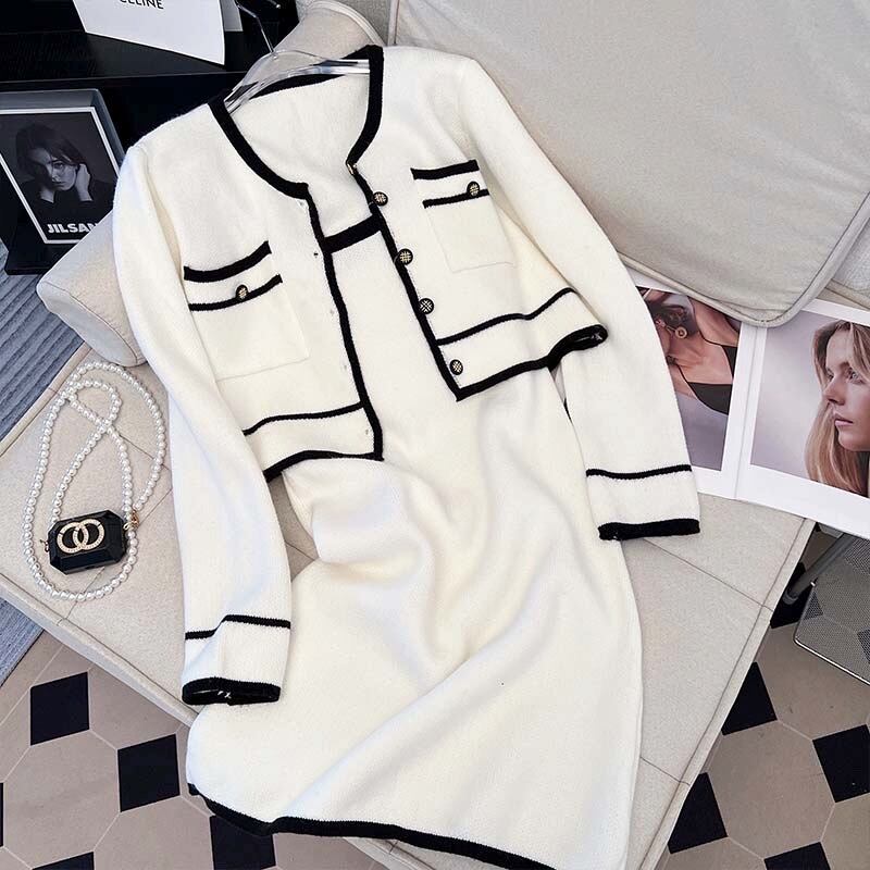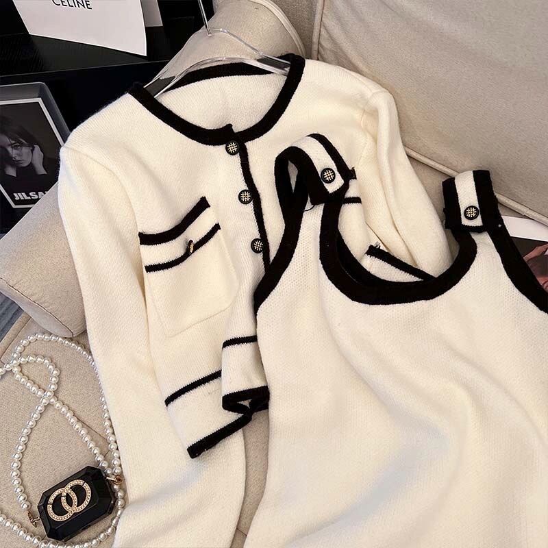 ニット女性ポケット ボタン セーター カーディガン + スパゲッティ ストラップ ドレス セット秋の小さな香りツーピース スーツ オータム 秋物 Rhc77306925500