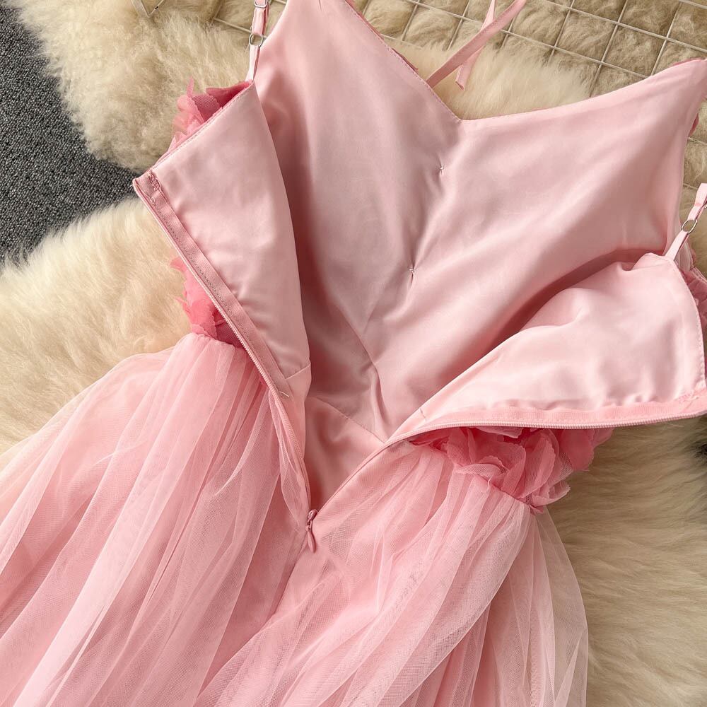 女性のピンクのストラップ ドレス メッシュ裾ノースリーブ ウエスト バギー ロング スカート夏 サマー 夏物 Abe24734580029
