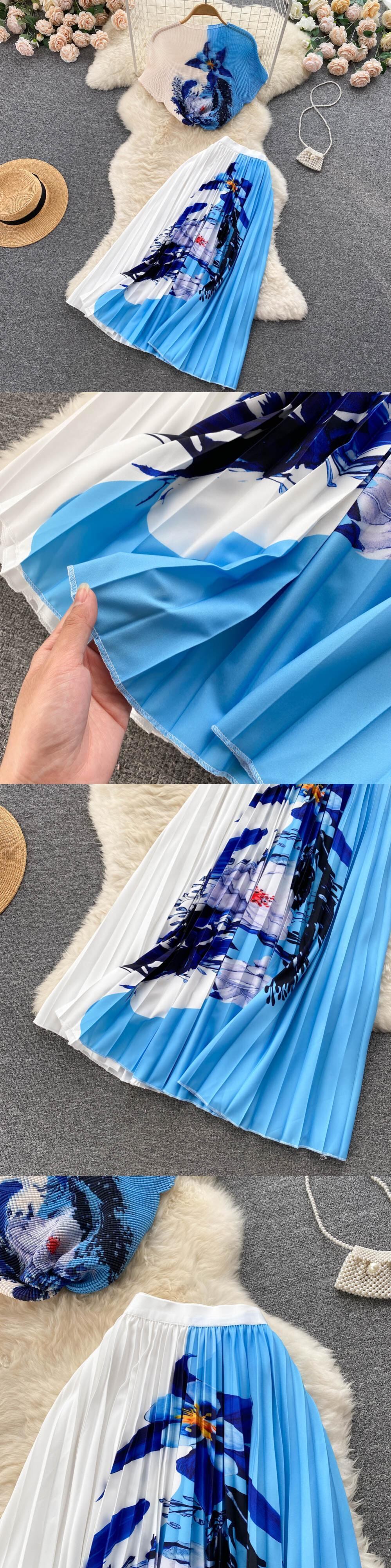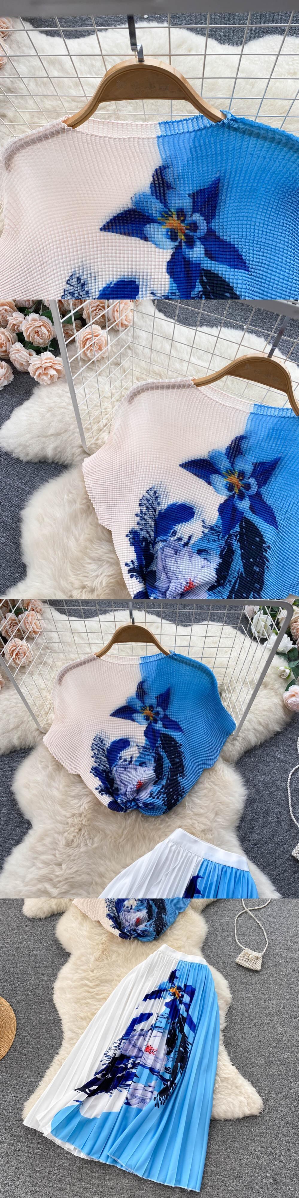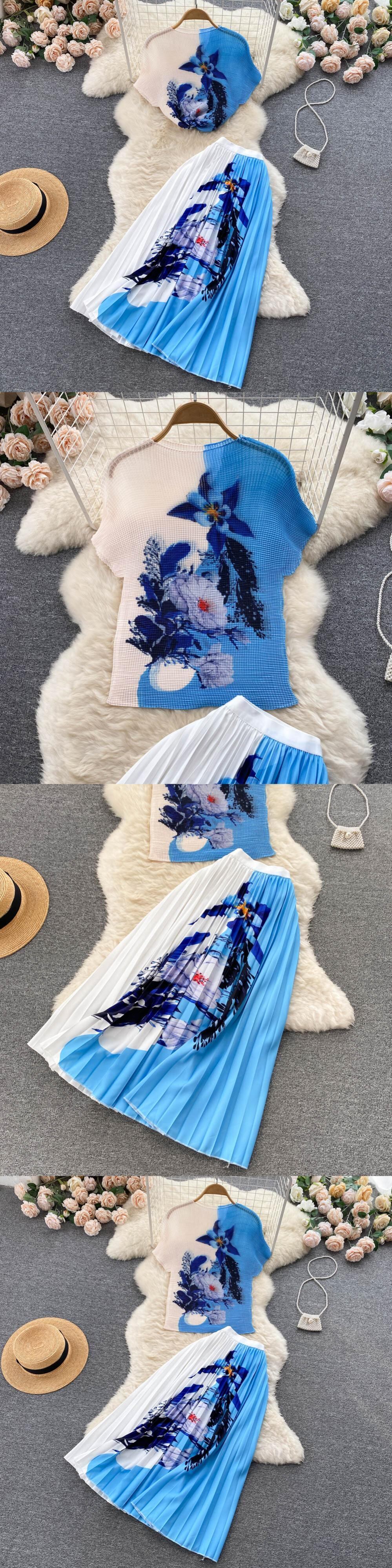 ボヘミアンバケーションビーチ 2 個セット女性花柄プリント半袖トップスとウエストプリーツロングスカートスーツ春夏 ショート ハーフスリーブ スプリング 春物 サマー 夏物 Abe58237161578