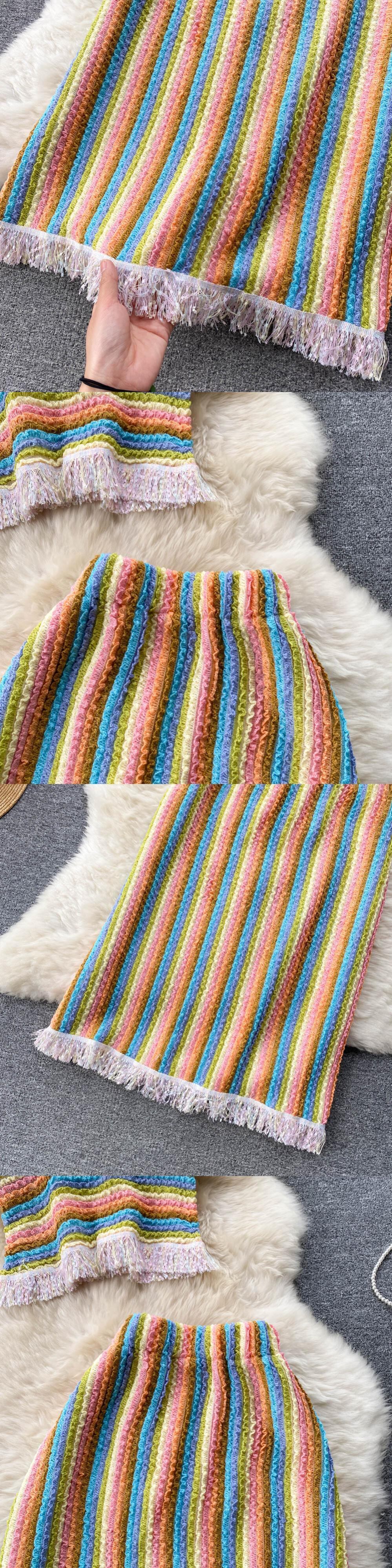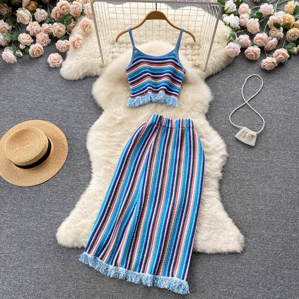 ストライプ ニット セット女性電話夏 2022 ストラップ ショート トップス弾性ウエスト a ライン ロング スカート ツー ピース スーツ エラスティック 伸縮 サマー 夏物 Aライン Abe18948757558
