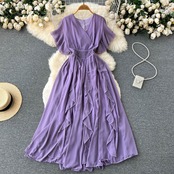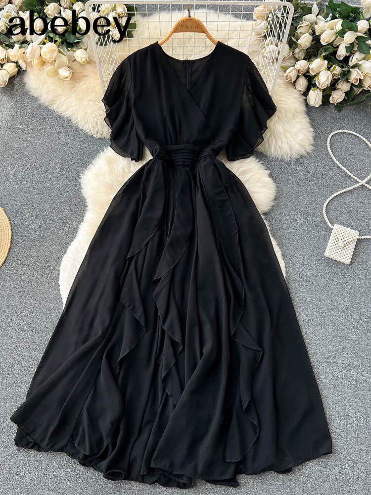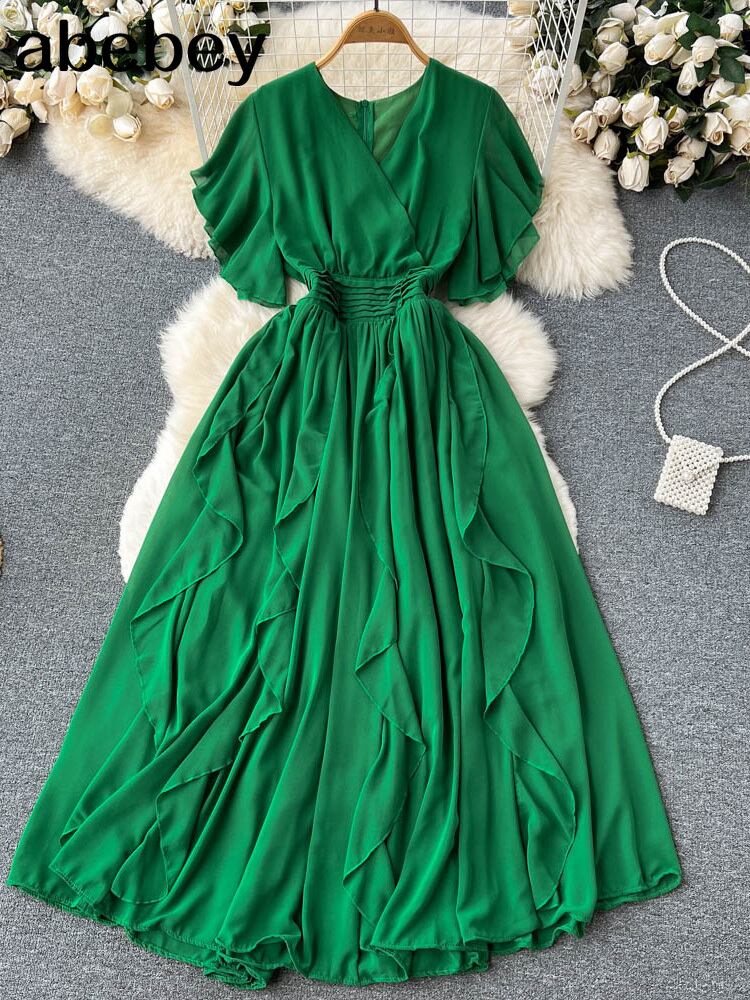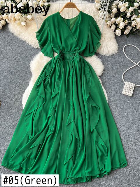 グリーン/レッド夏の女性プリーツ パーティー ロング ドレス セクシーな V ネック半袖ウエスト A ライン マキシ Vestidos 休暇ビーチ ローブ ショート ハーフスリーブ サマー 夏物 Vネック Aライン Abe21698341273