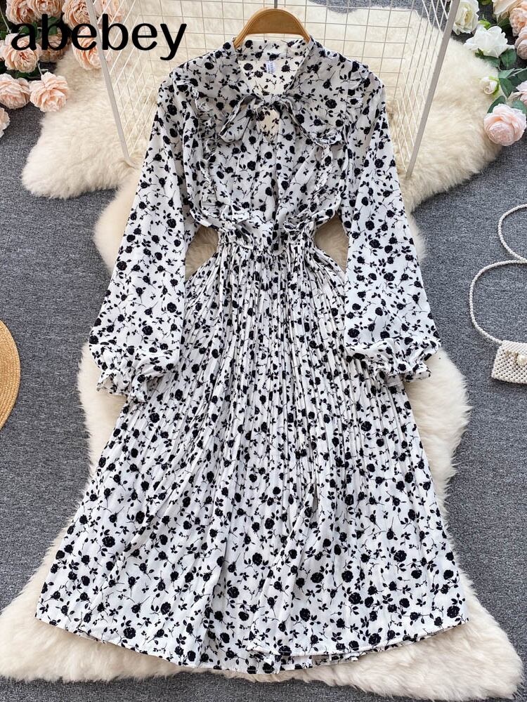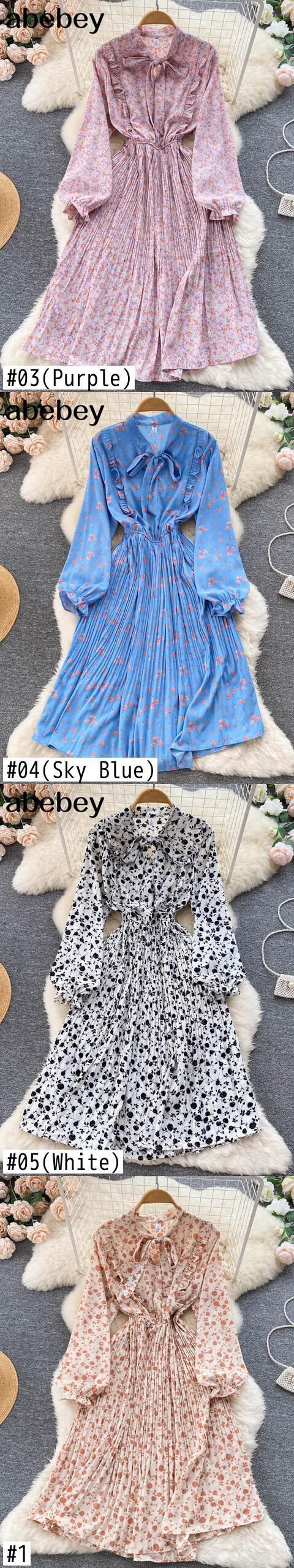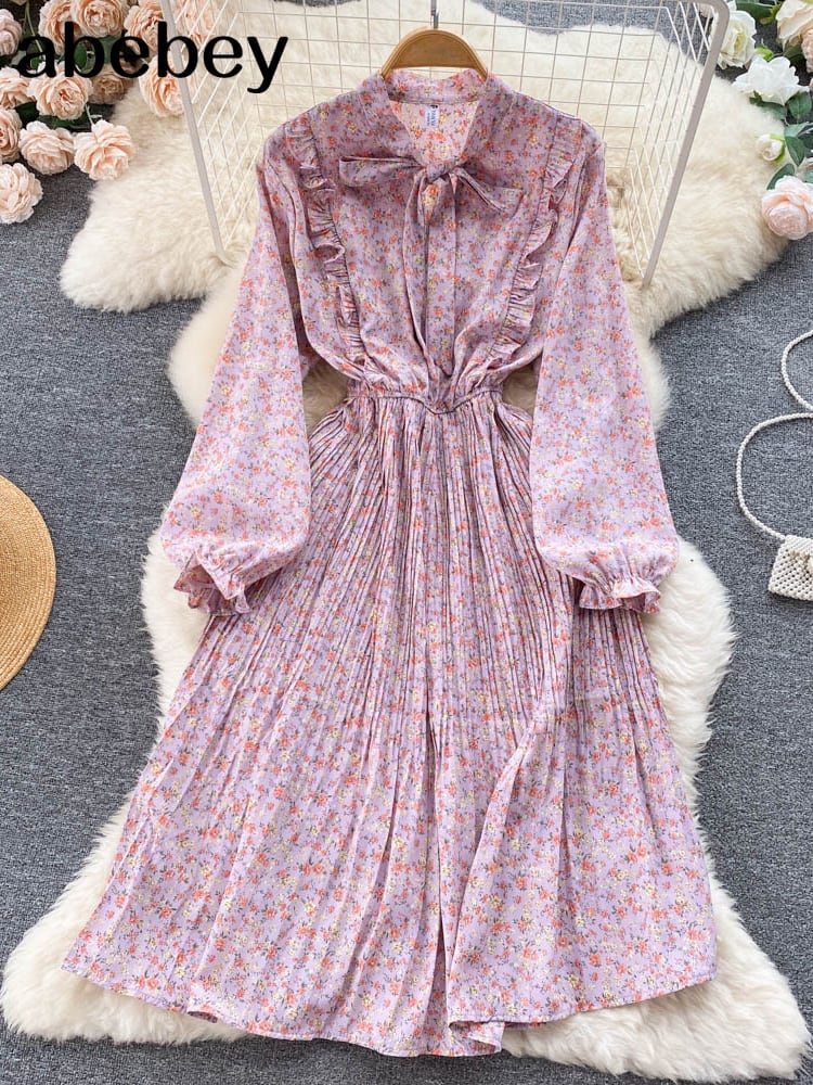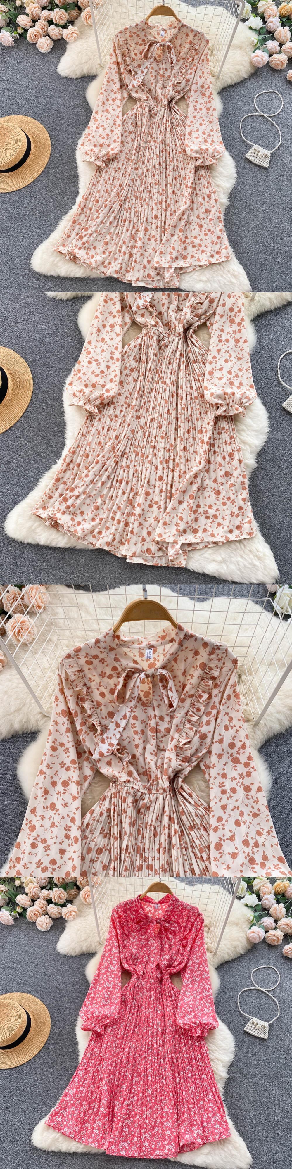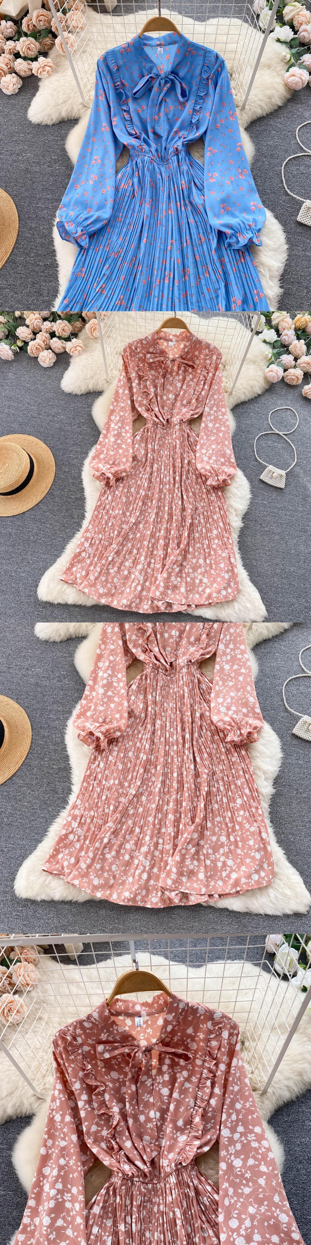 2022 夏シフォン花柄ドレス甘い蓮の弓の襟 A ライン プリーツ ミディ ドレス ドレス vgvfhzy 女性 リボン 大人ガーリー スウィート キュート カジュアル サマー 夏物 Aライン Abe29517400867