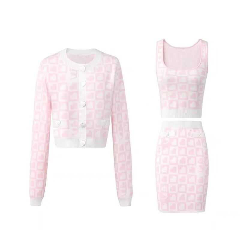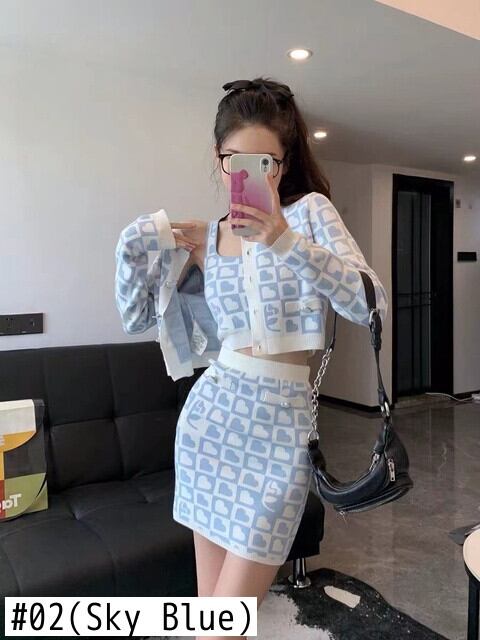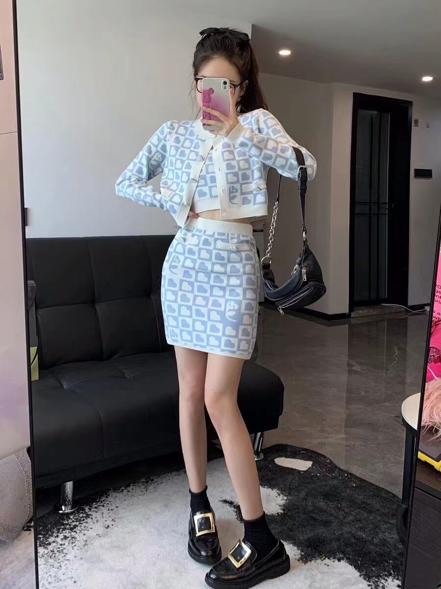チェック柄ニット 3 点セット女性シングルブレストセーターカーディガン + クロップトップ + 弾性ウエストミニスカートセットトラックスーツ エラスティック 伸縮 Rhc94368087098