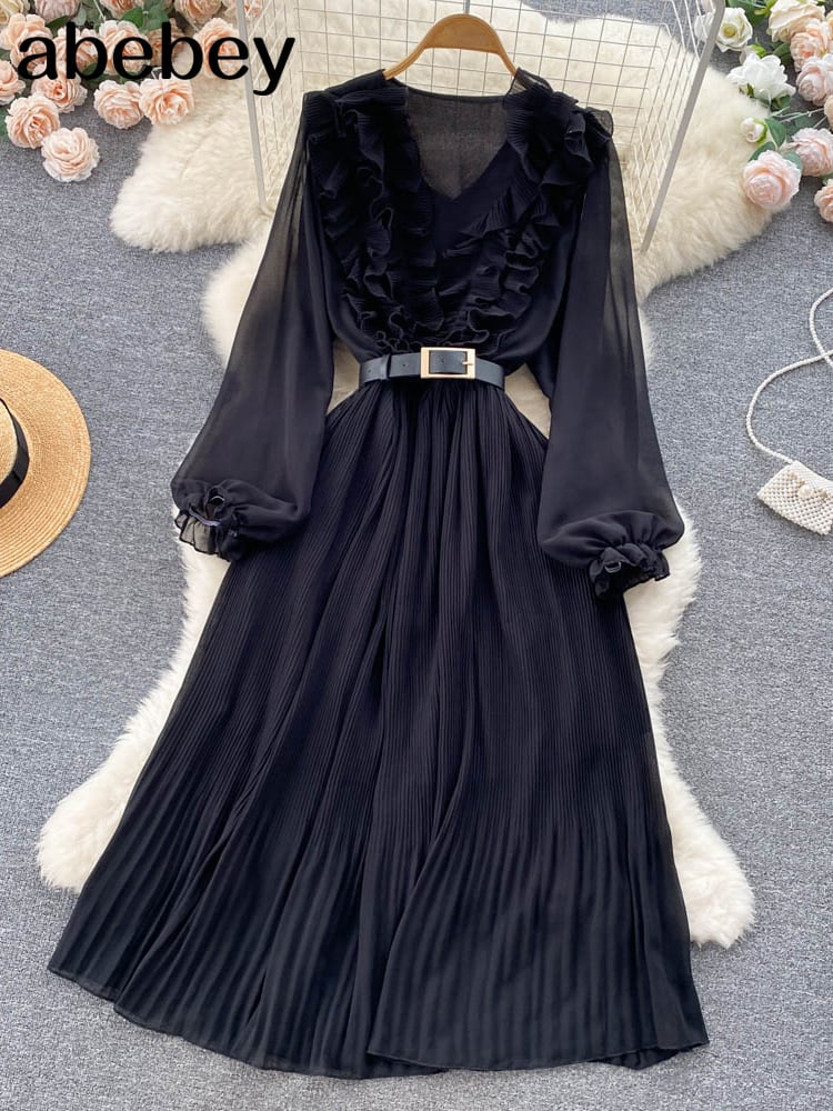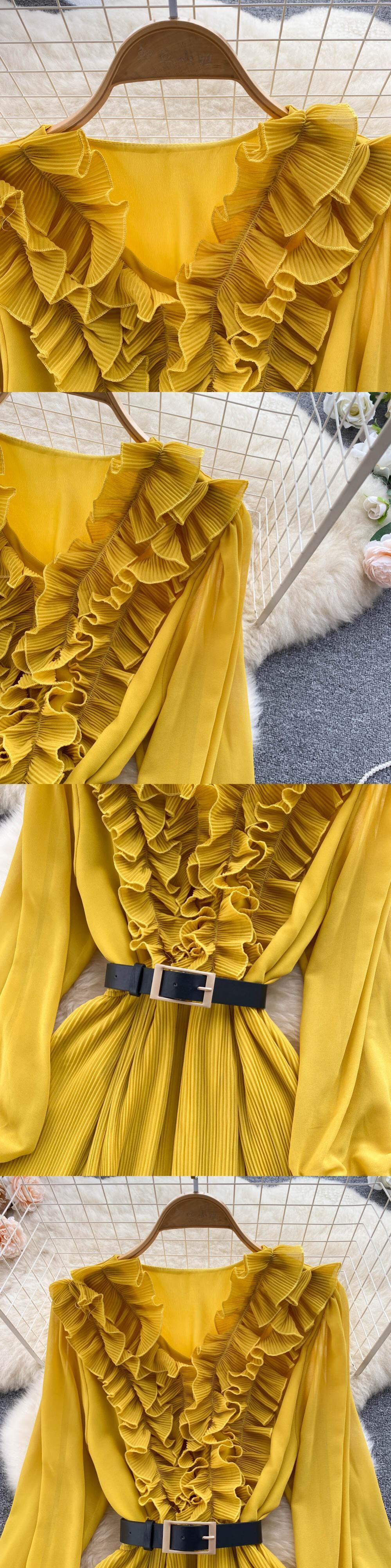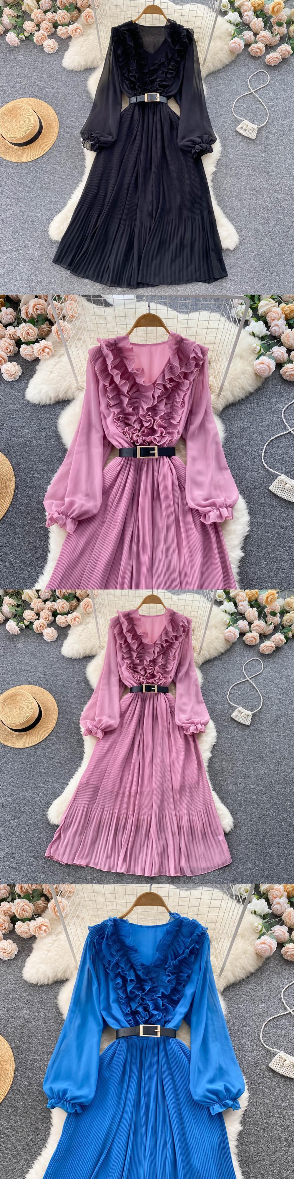 夏の女性プリーツロングドレス V ネック長袖ウエスト A ライングリーン/ブルー/ピンクビッグスイングマキシ Vestidos サマー 夏物 Vネック Aライン Abe82335603673