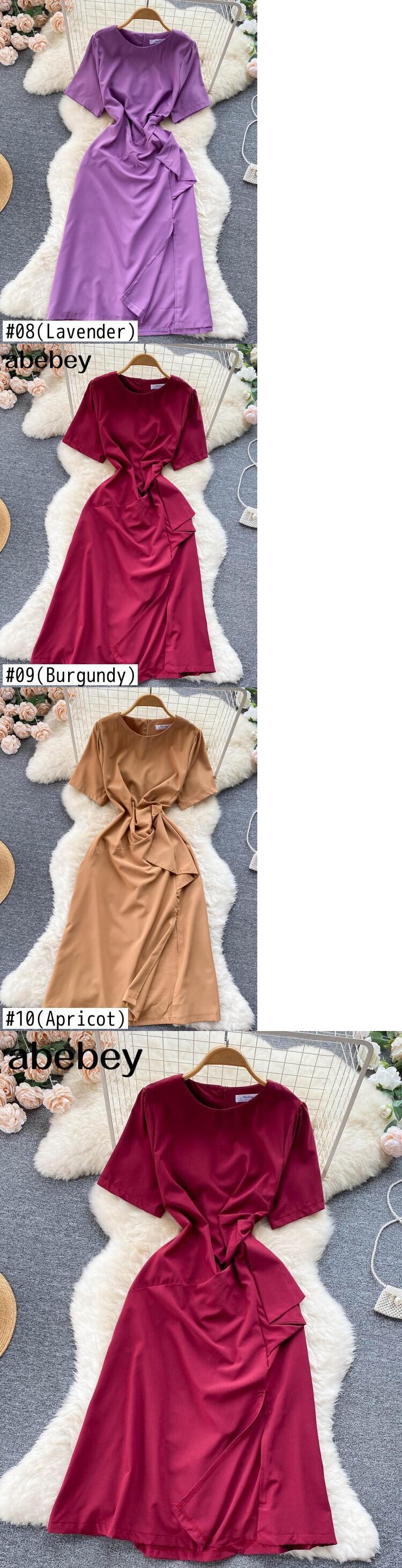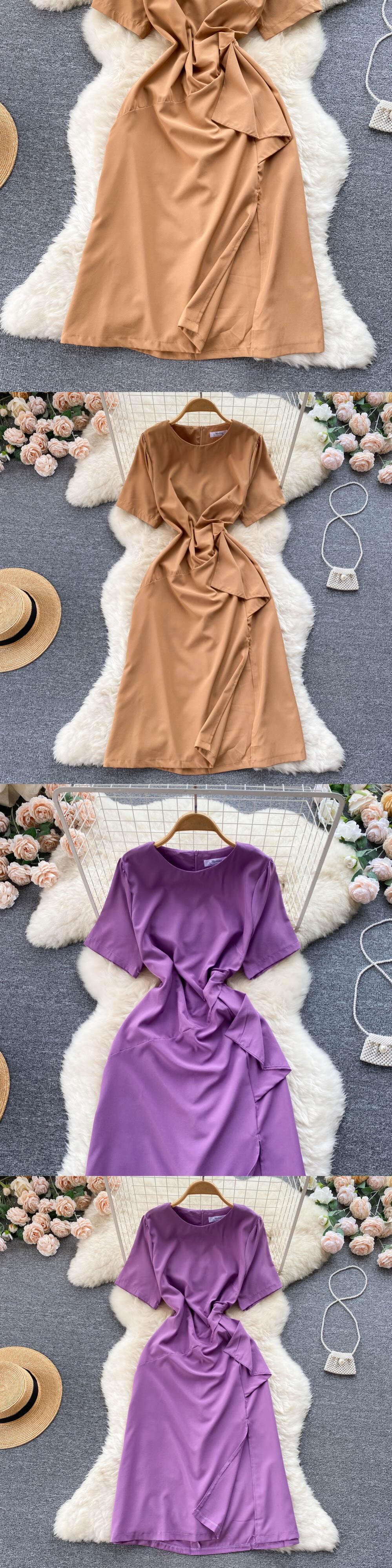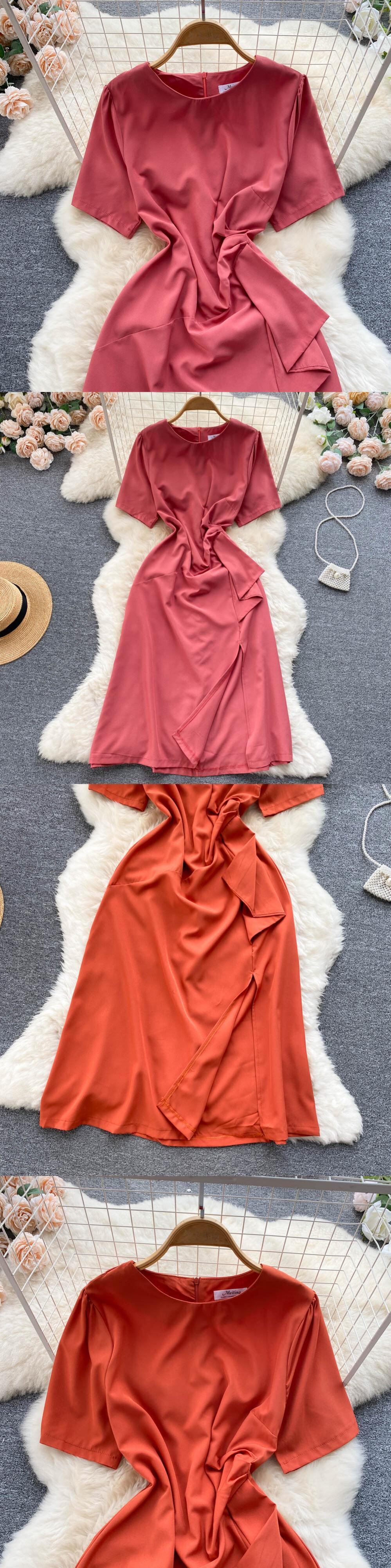 無地ボウロングワンピース レディース 2022年 ラウンドネック 半袖 レースアップ サイドワンピース レトロ バケーション ビーチ D ショート リボン ハーフスリーブ Oネック ソリッドカラー Abe80560746880