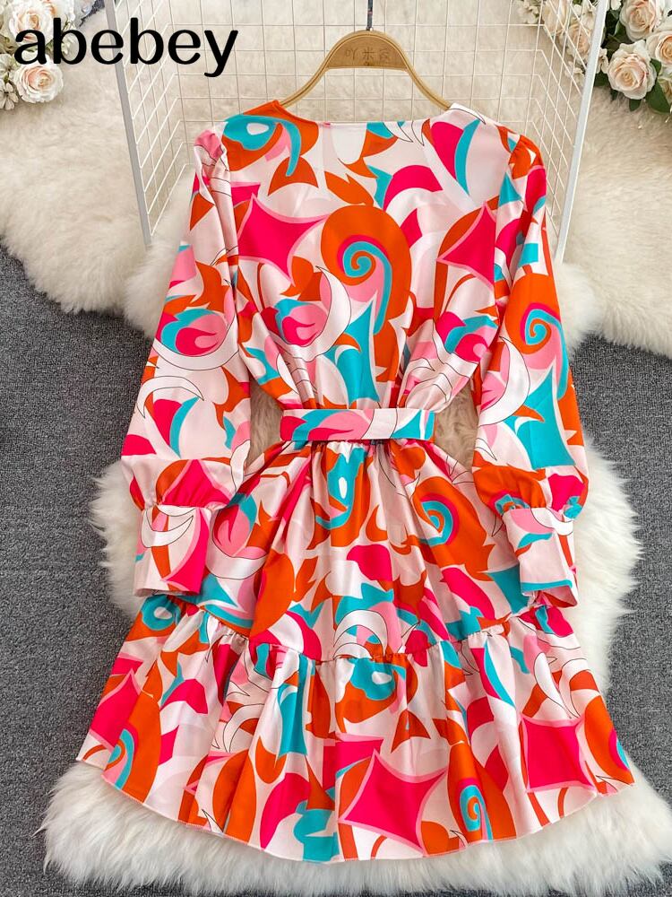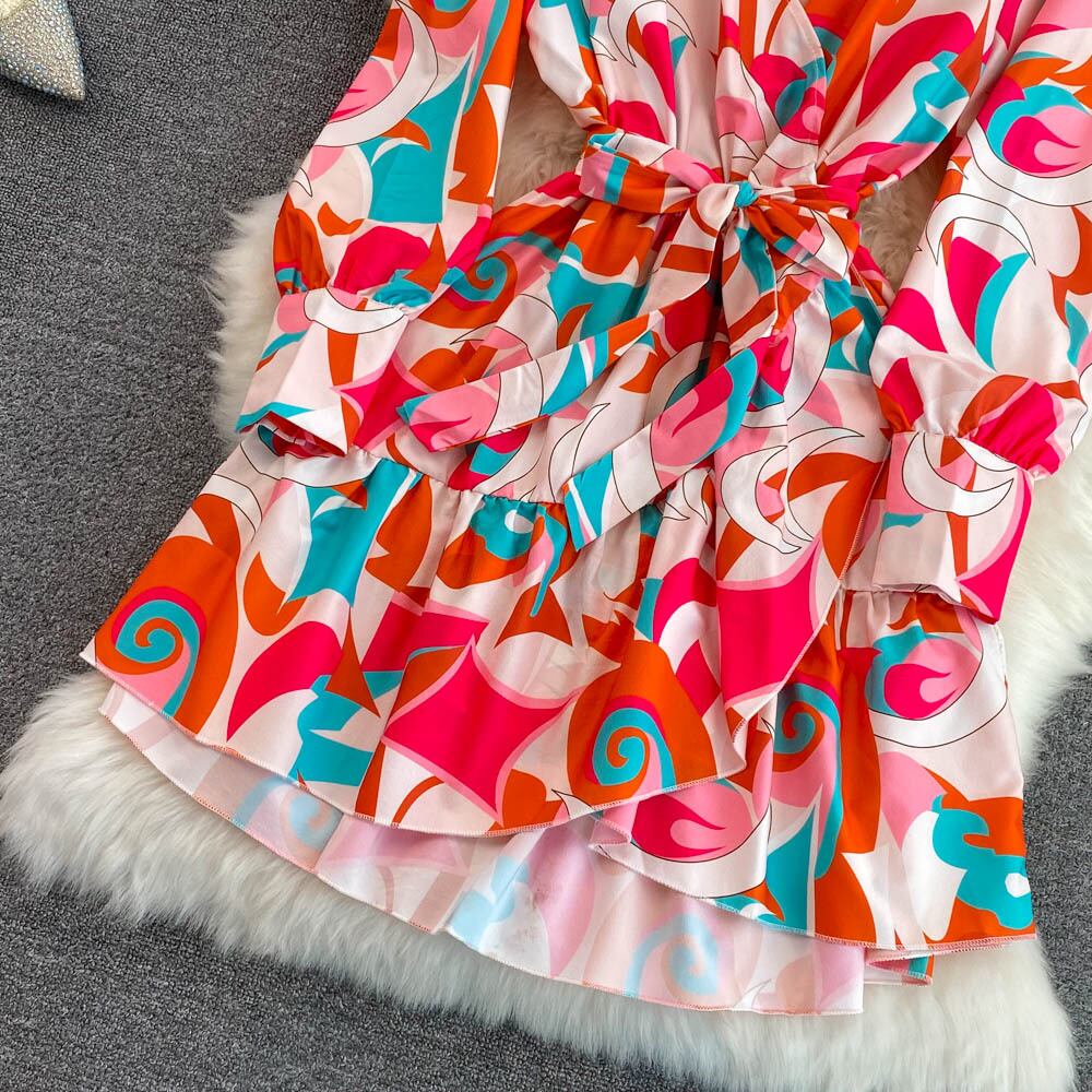 女性フラワープリントフリルラップドレス春の花 V ネックロングランタンスリーブドレスレディヒョウ A ラインパーティー Vestidos ラッフル スプリング 春物 花柄 Vネック Aライン フラワーデザイン Abe8717681694
