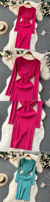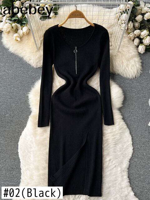 女性ニットペンシルドレス長袖ジッパースプリット弾性スリムドレス秋冬セクシーなボディコン暖かいセータードレス ロング エラスティック 伸縮 オータム 秋物 ウィンター 冬物 Abe70170365786