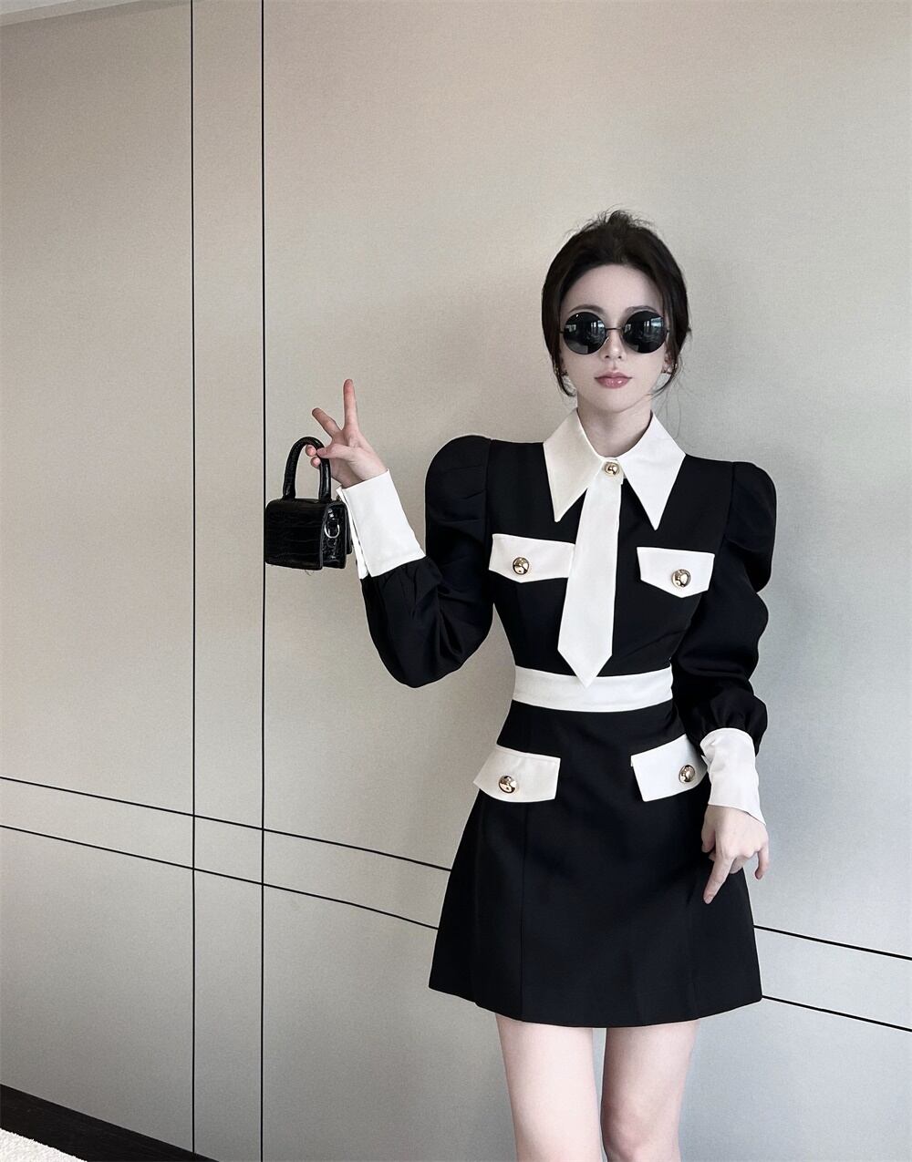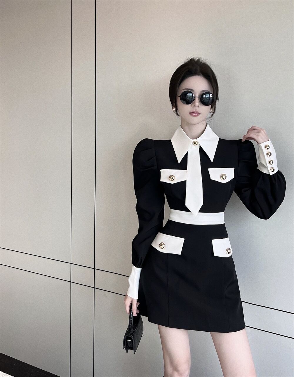 2022 秋バロックドレス女性のネクタイ長袖黒、白のコントラストカラーパッチワークボタンドレス ロング ホワイト ブラック オータム 秋物 Rhc32031137932