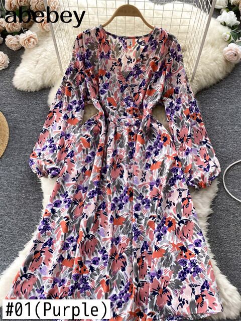 春秋の女性プリント V ネック パフ スリーブ ドレス ホリデー スタイル ウエスト A ライン ミディアム ロング ドレス スプリング 春物 オータム 秋物 Vネック Aライン Abe51576559565