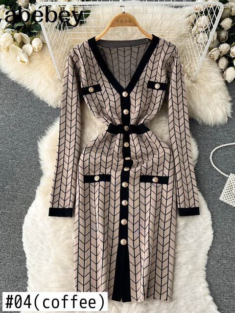 秋のフレンチチェック柄ニットドレス女性 V ネックセーターシース t ドレス弾性ウエスト OL 暖かいミディロングドレス エラスティック 伸縮 オータム 秋物 Vネック Abe29504213740