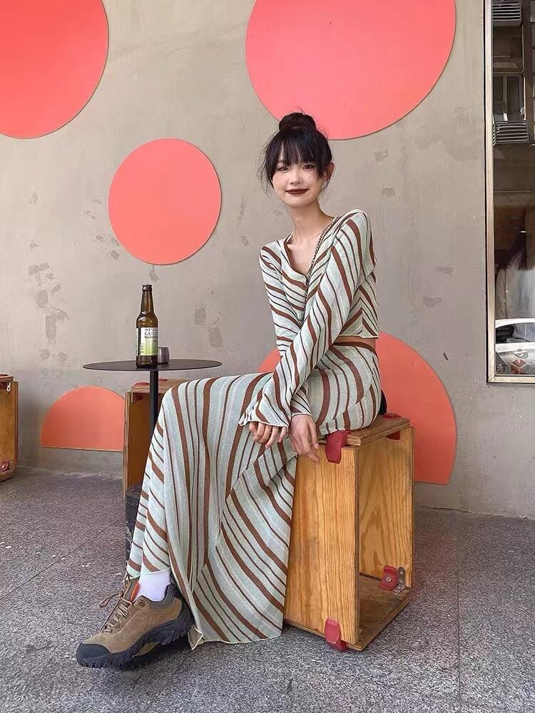 ストリートスタイルストライプニットツーピースセット女性スカート V ネッククロップトップとウエストロングスカート 2 点セットレディース衣装 Vネック Rhc1669300883