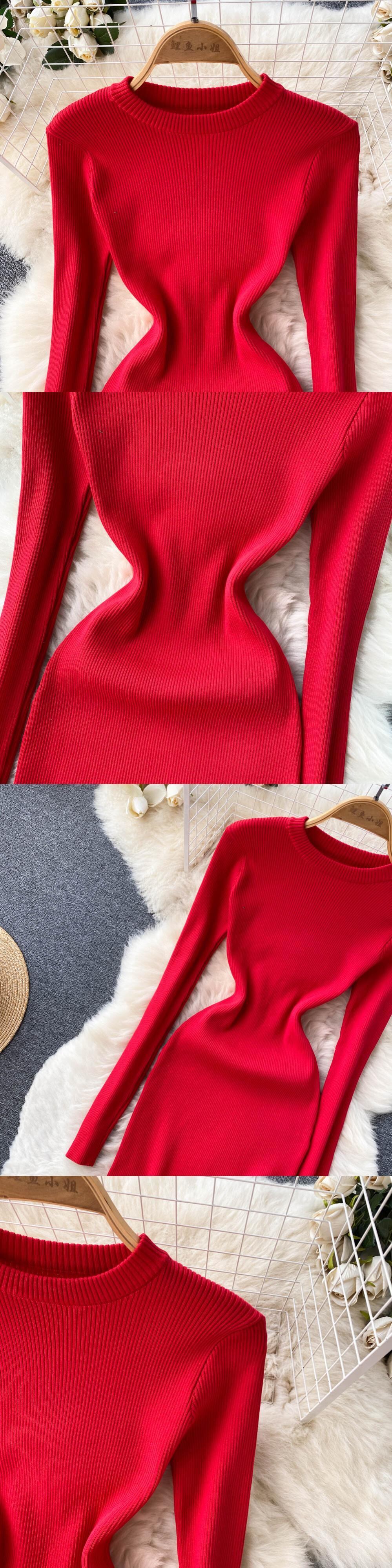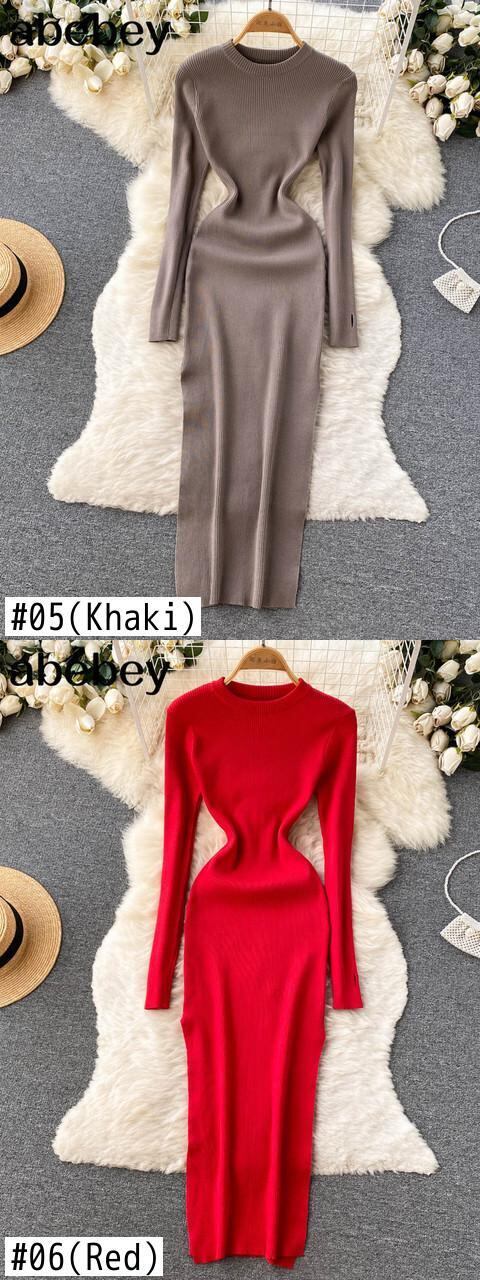 秋シニアニットドレス女性長袖弾性ウエストスプリットセータードレスパーティーセクシーな暖かいロングドレス エラスティック 伸縮 オータム 秋物 Abe85999054797