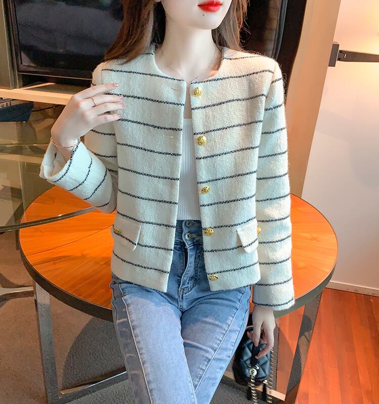 2022 秋長袖女性ツイードコートシンプルルースすべてマッチストライプカーディガンゴールデンボタントップス ロング オータム 秋物 Rhc50080458629