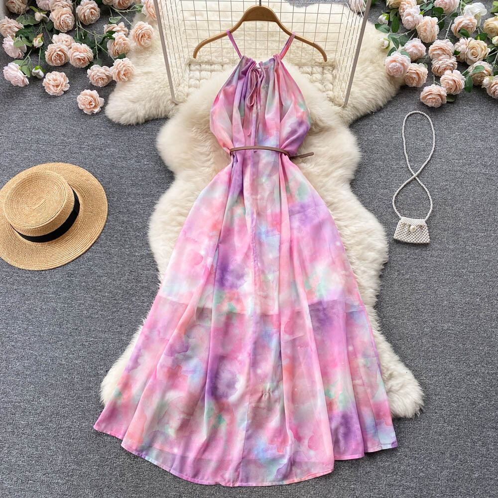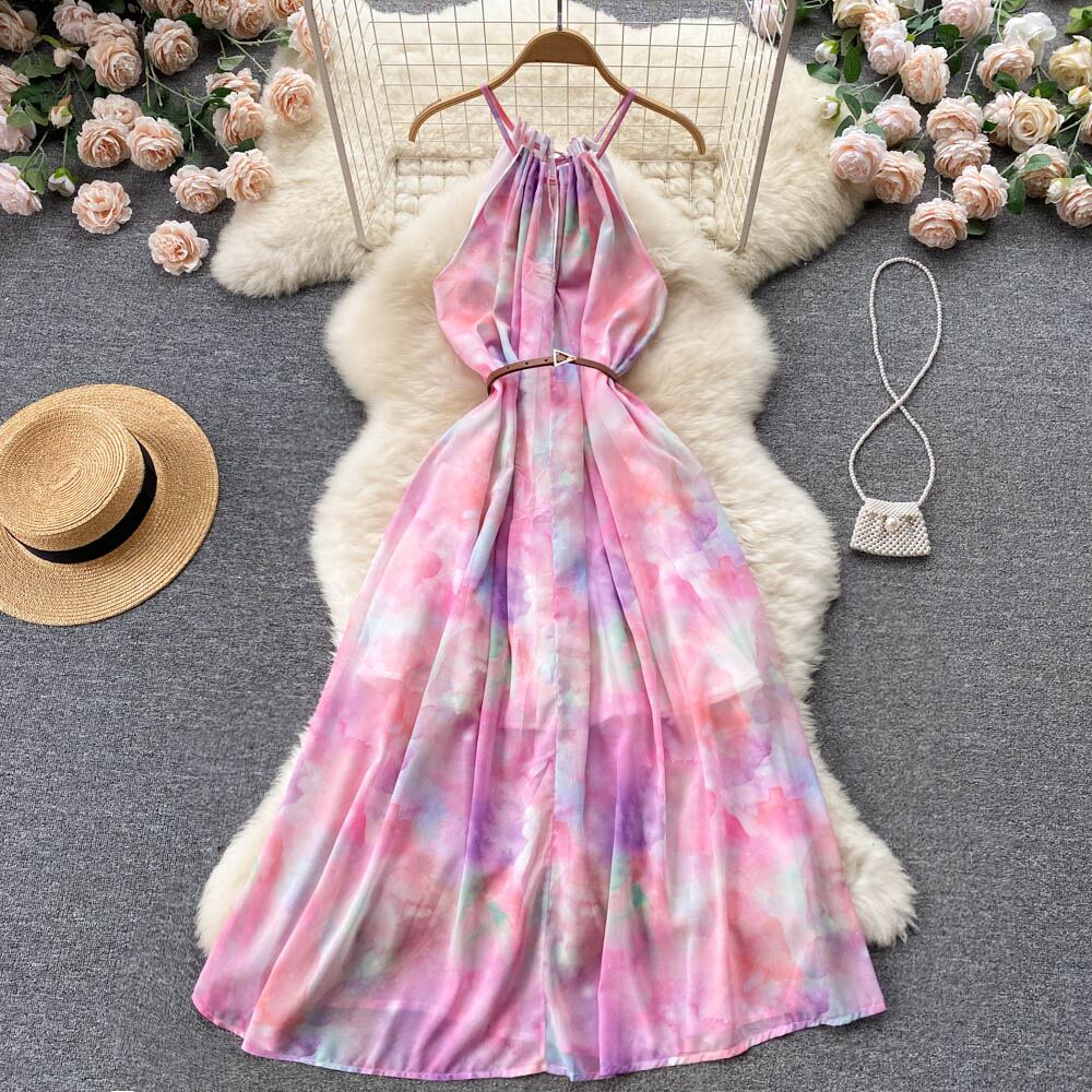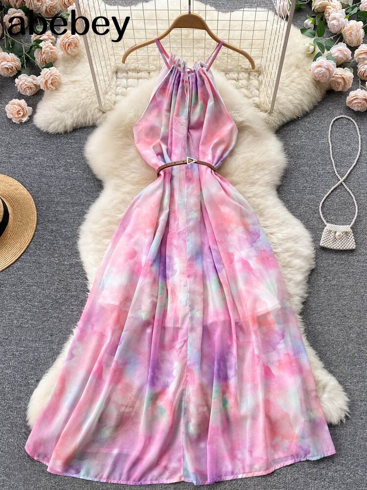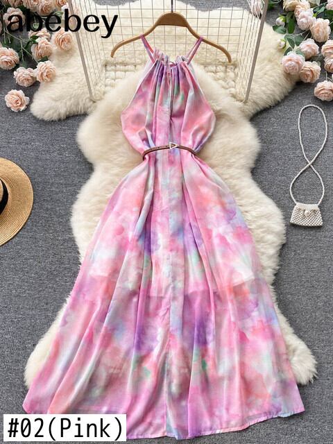 夏の女性の花スパゲッティストラップロングドレスボヘミアンバケーションビーチマキシローブピンク/ホワイト A ライン Vestidos サマー 夏物 花柄 Aライン Abe58485505446