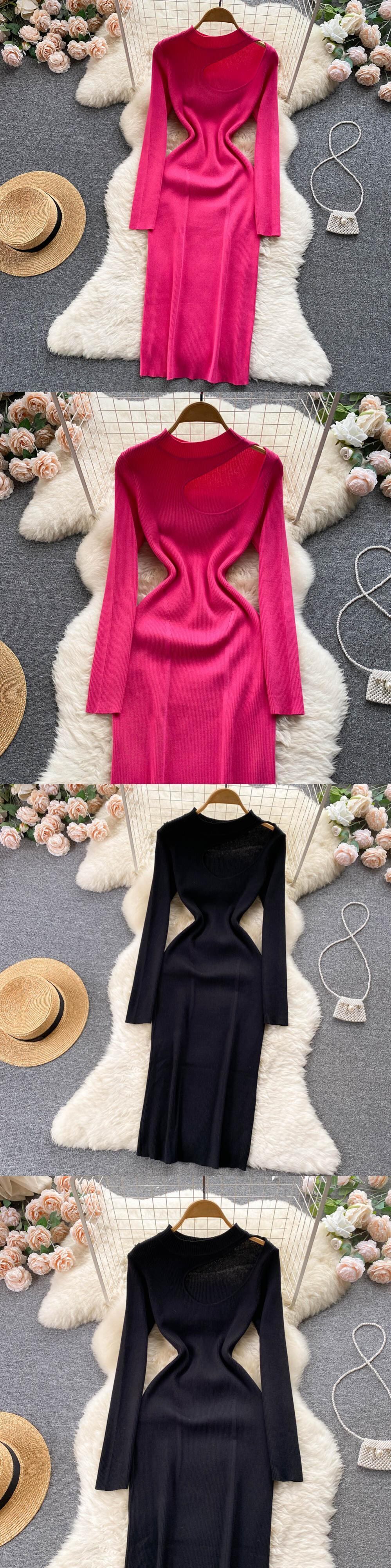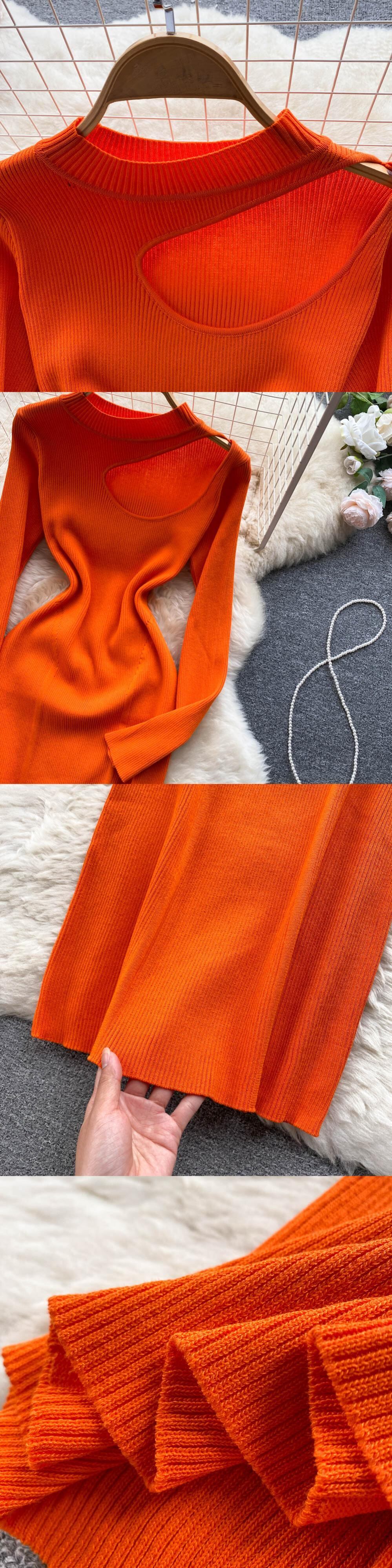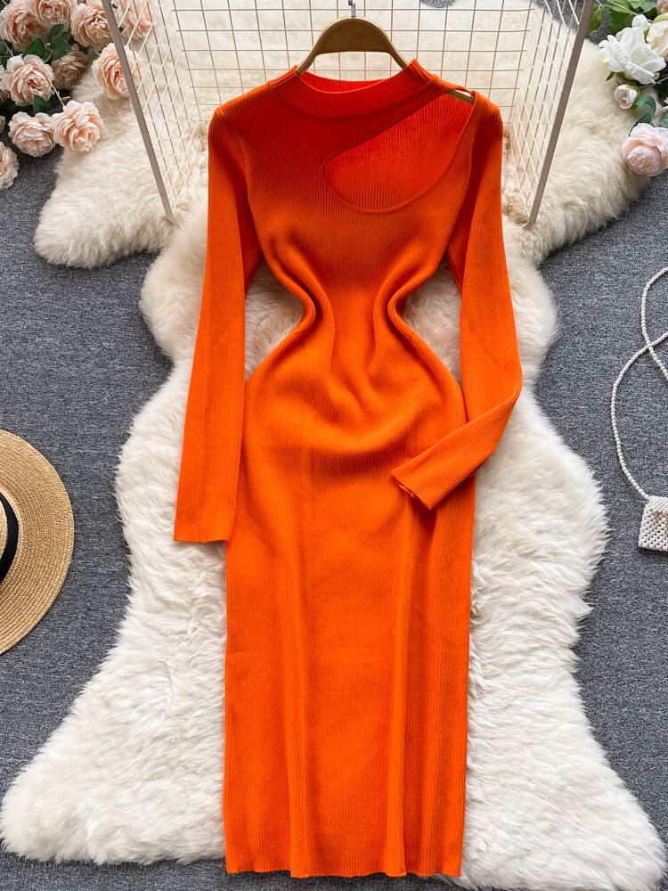 2022 中空アウトニットドレス女性長袖弾性ウエストスプリットセータードレスパーティーセクシーな暖かいボディコンマキシロングドレス エラスティック 伸縮 Abe415769308