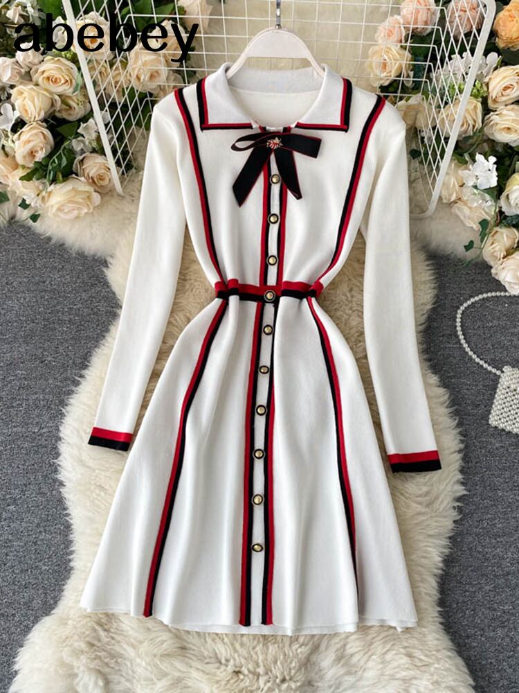 冬の女性のセータードレスシングルブレスト長袖ドレスニットストリップちょう結びラペル膝丈ドレス ロング リボン ウィンター 冬物 Abe84135854420