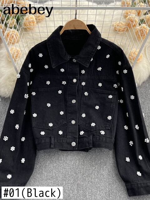 ビーズ刺繍ルーズデニムクロップドジャケットポケットシングルブレストシン原宿ストリートショート生き抜くコート かわいい Abe15373607762
