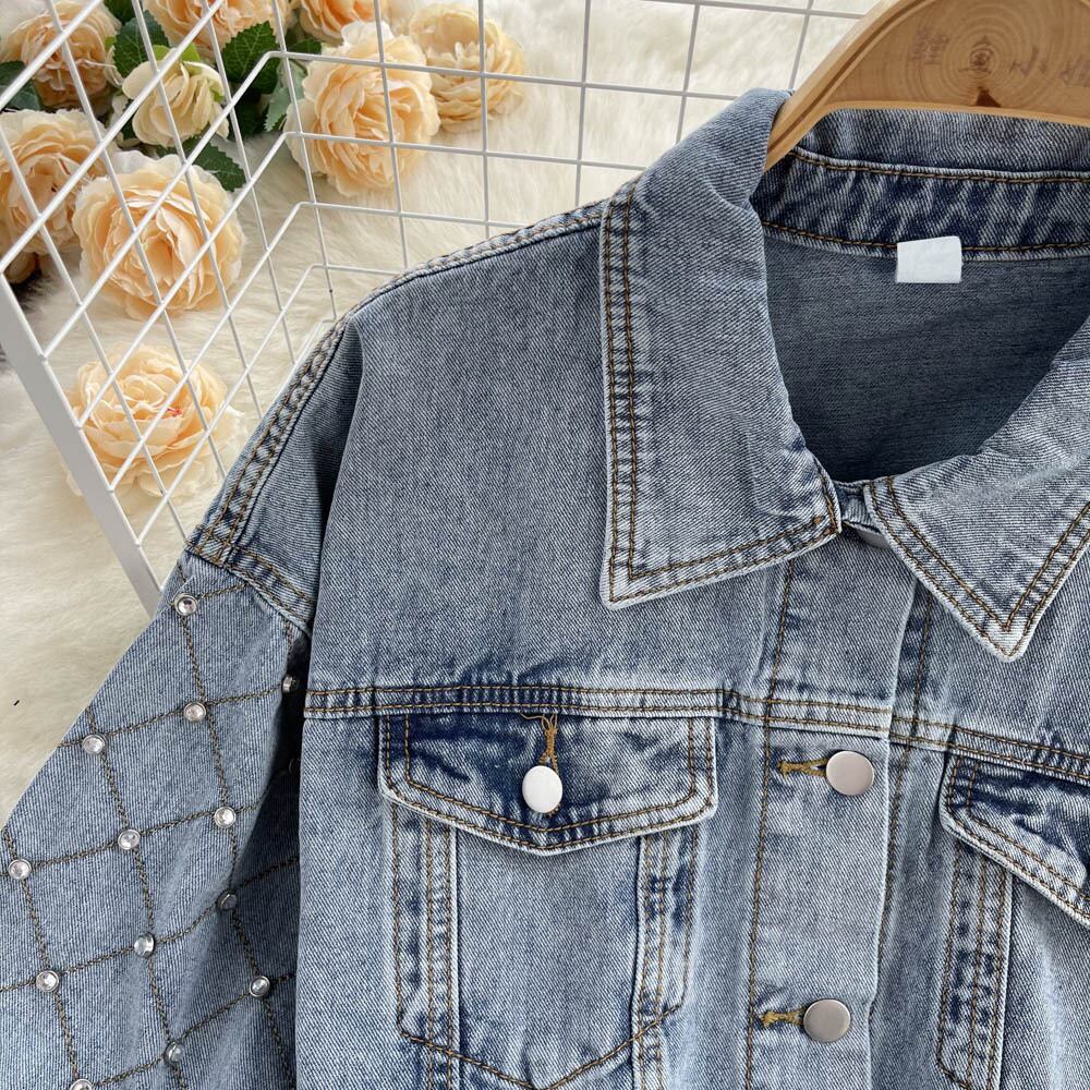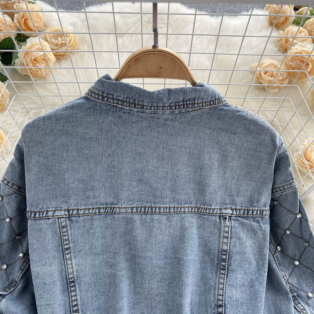 女性のデニムクロップドジャケットビーズ秋シングルブレストショートジーンズジャケットストリートポケットコート オータム 秋物 Abe44521052161