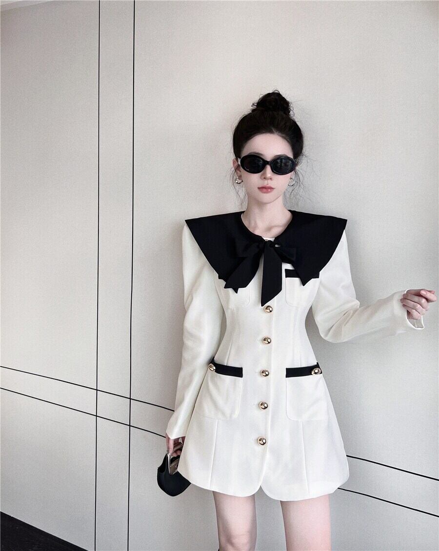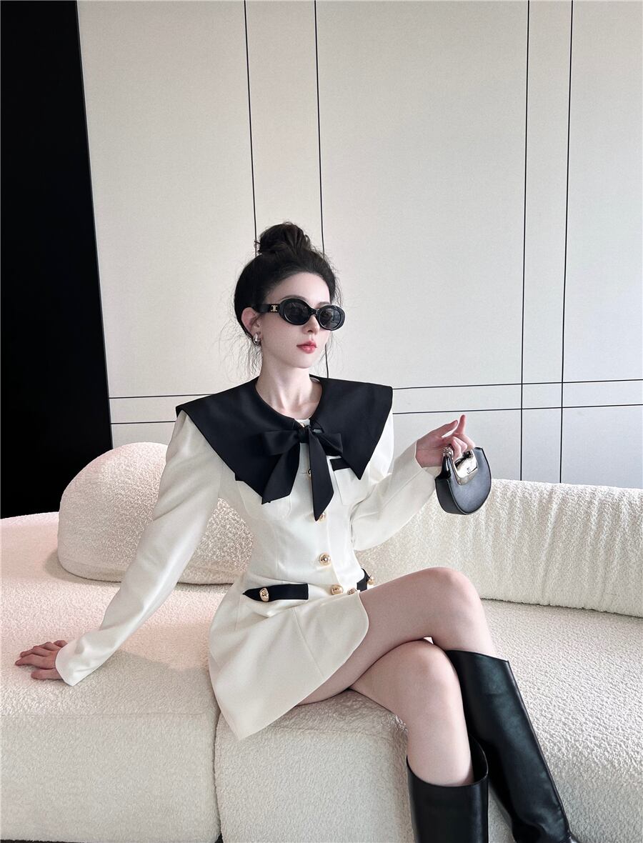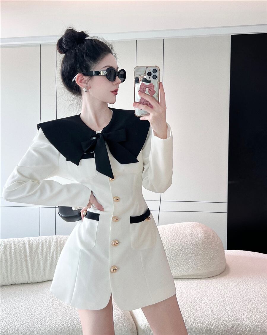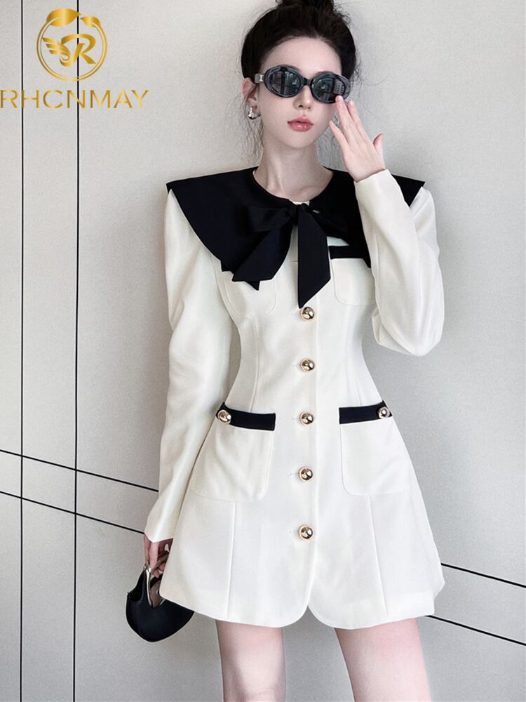2022 秋ドレス女性長袖シングルブレストちょう結びダブルポケット A ラインミニドレス ロング リボン オータム 秋物 Aライン Rhc21495655290