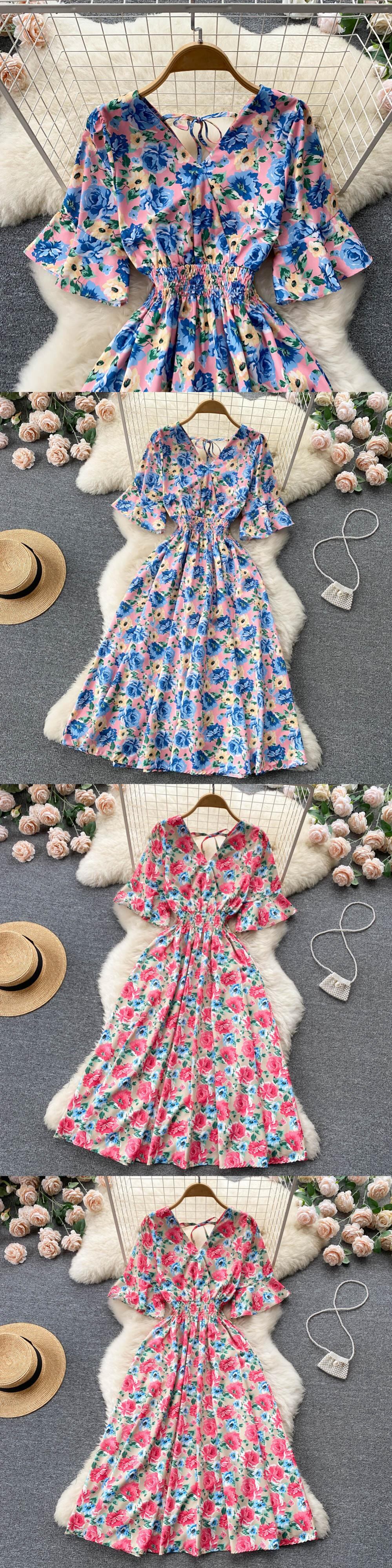 2022 夏の女性フリル半袖ドレス V ネックウエスト花柄ビーチミディドレス背中の開いたセクシーな Vestidos サマー 夏物 Vネック Abe10567227171