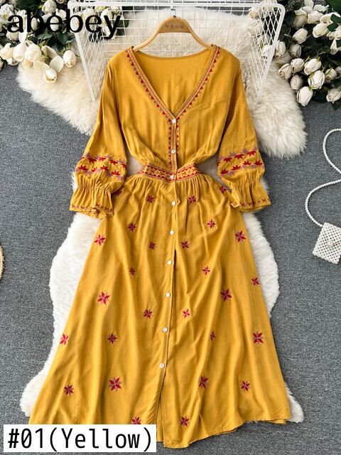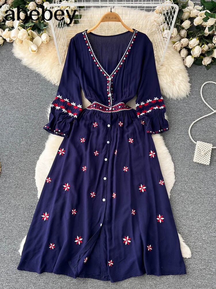女性フローラル Emberoidery ビーチボヘミアンマキシドレス V ネックランタンスリーブ秋のドレス Vestidos オータム 秋物 花柄 Vネック Abe43657618967