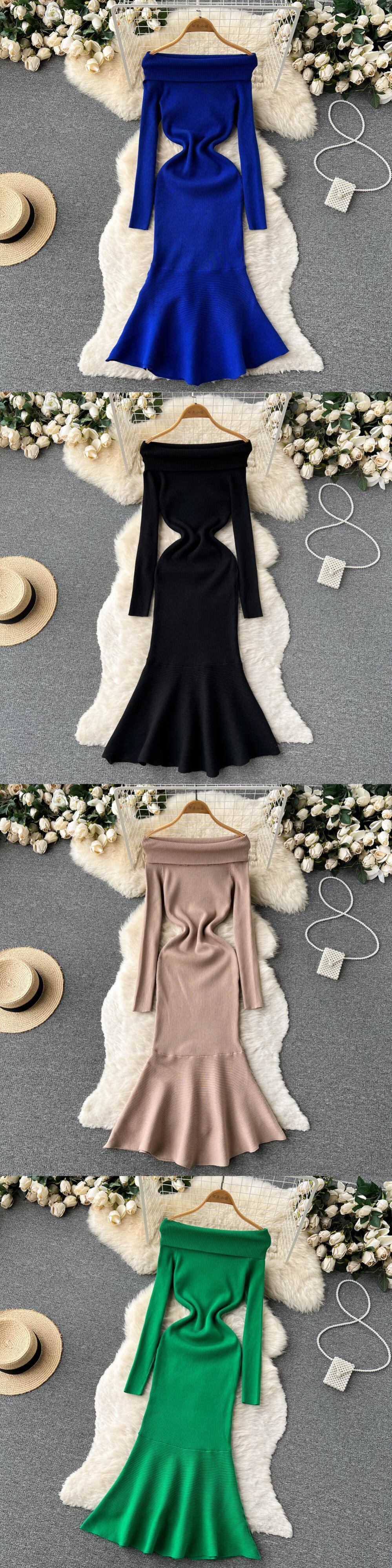 スラッシュネックソリッドセクシーなセータードレス 2022 女性マーメイド長袖マキシロングドレス秋のストリートニットボディコンドレス オータム 秋物 ソリッドカラー Abe17473892843
