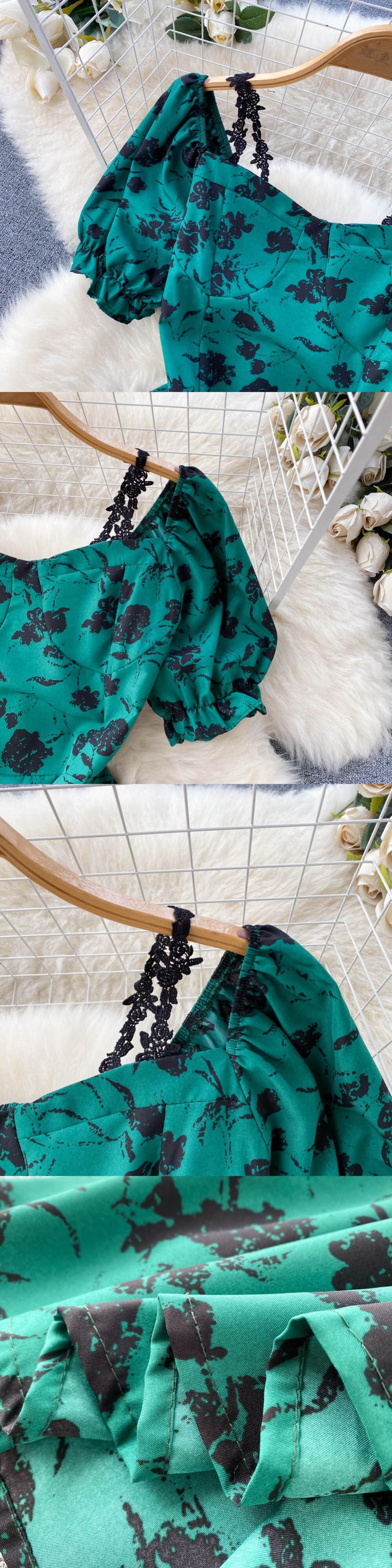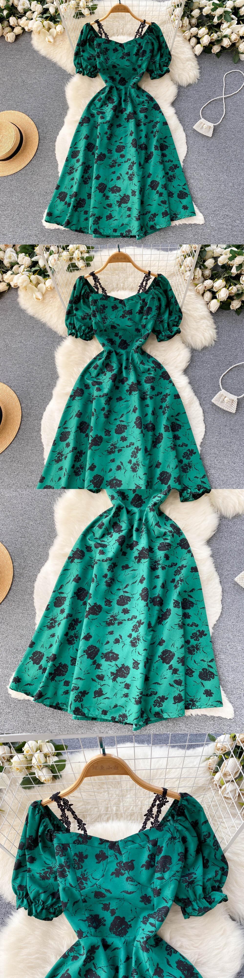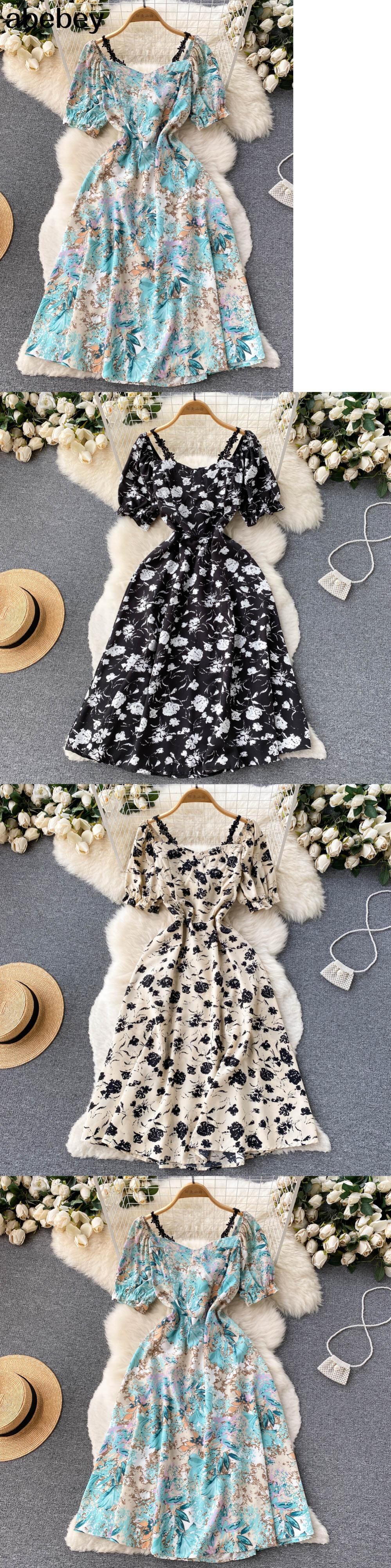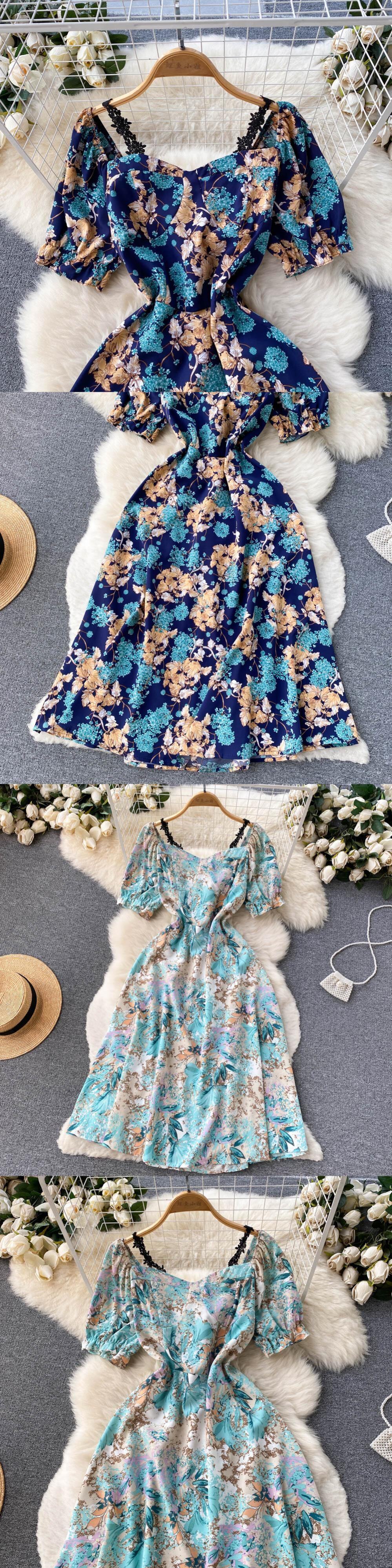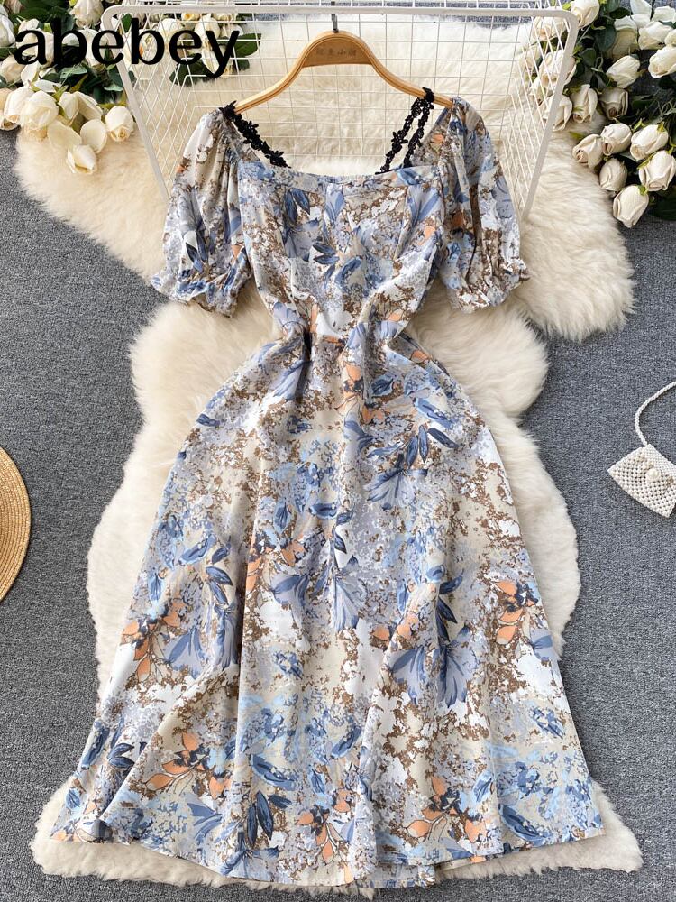 女性フローラルドレススウィートパフスリーブスクエアカラーAラインシフォンドレス夏自由奔放に生きるプリントバケーションビーチサンドレス 大人ガーリー キュート カジュアル サマー 夏物 花柄 スクウェア Abe968278574