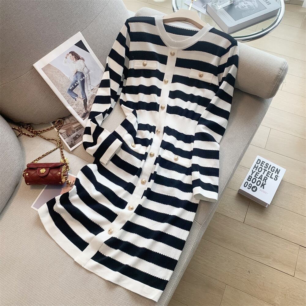 秋のセータードレス女性服ゴールドラインストライプボタンアップ V ネック長袖ストリートニットボディコンドレス ロング オータム 秋物 Vネック Rhc59237992756