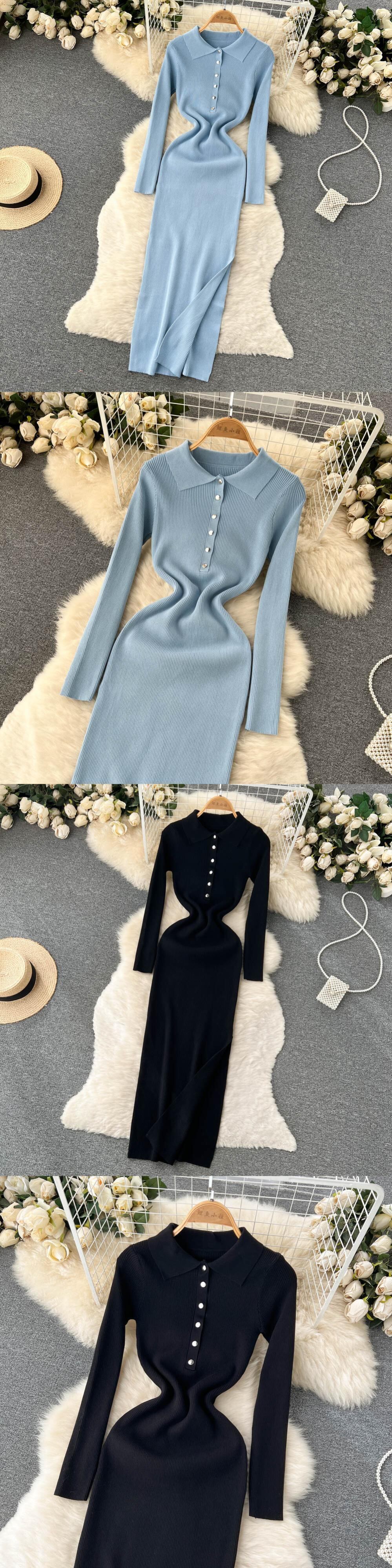 2022 秋ニットドレス女性長袖弾性ウエストスプリットセータードレスパーティーセクシーな暖かいボディコンマキシロングドレス エラスティック 伸縮 オータム 秋物 Abe5935821860