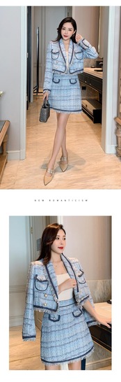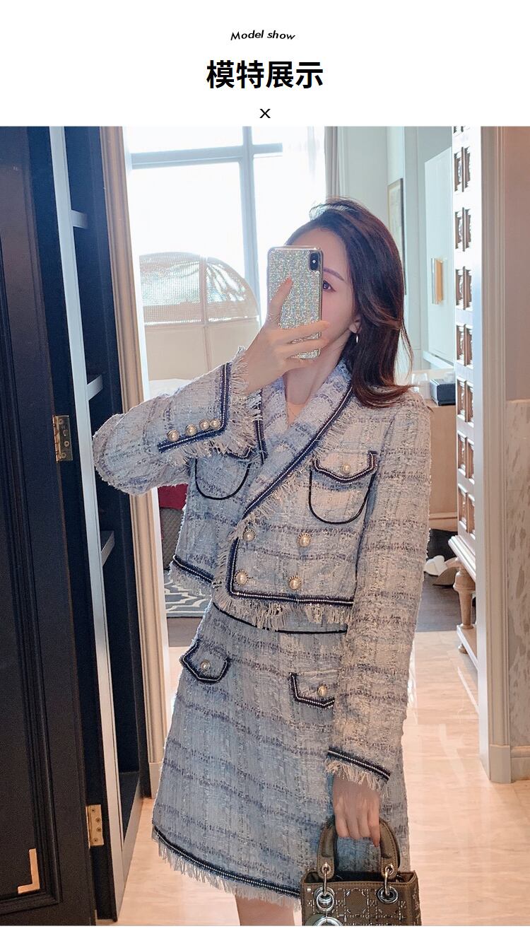 女性ツイードスカートセット 2022 秋の電話ビーズウールツイードジャケット + A ラインショートスカートスーツツーピースセット オータム 秋物 Aライン Rhc95572555036